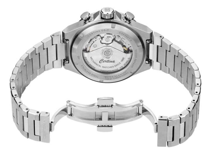 Мужские часы-хронографХронографФункция позволяет измерять отрезки времени с особой точностью: часы, минуты, секунды. Верным признаком хронографа является наличие на циферблате 3 дополнительных окошек-счётчиков. Certina DS-7 Chrono Auto C043.427.21.051.00. Корпус часов изготовлен из нержавеющей стали 316L. Под твердым сапфировым стекломСапфировое стеклоПрочный и надёжный материал из кристалла сапфира синтетического происхождения, характеризующийся особой твёрдостью и устойчивостью к царапинам и повреждениям. с антибликовым покрытиемАнтибликовое покрытиеСлой оксида металла в 0,13-0,3 микрон, благодаря которому стекло часов не бликует и не отражает свет. Антибликовое покрытие уменьшает отражение света в 10 раз, обеспечивая отличную читаемость показателей циферблата. Окошко даты в положении 6 часа, а также маркировку, покрытую люминесцентным покрытиемЛюминесцентное покрытиеПозволяет считывать показания времени в темноте. Производители наносят на стрелки, часовые индексы, безель или поверхность циферблата светонакопительный состав, дающий холодное свечение. Super-LumiNova. Класс водозащиты: 100 метров, позволит плавать, нырять и заниматься другими водными видами спорта. Стальной браслет на застёжке-бабочке с кнопкамиЗастёжка "бабочка"Такой вид застёжки дополняется предохранителями, помогающими избежать случайного раскрытия браслета. Обладают изящным исполнением. .ТахиметрТахиметрРазмеченная шкала, располагается на ободке или безеле часов. Тахиметр позволяет рассчитать скорость на определённом участке пути, расстояние измеряется в километрах или милях..