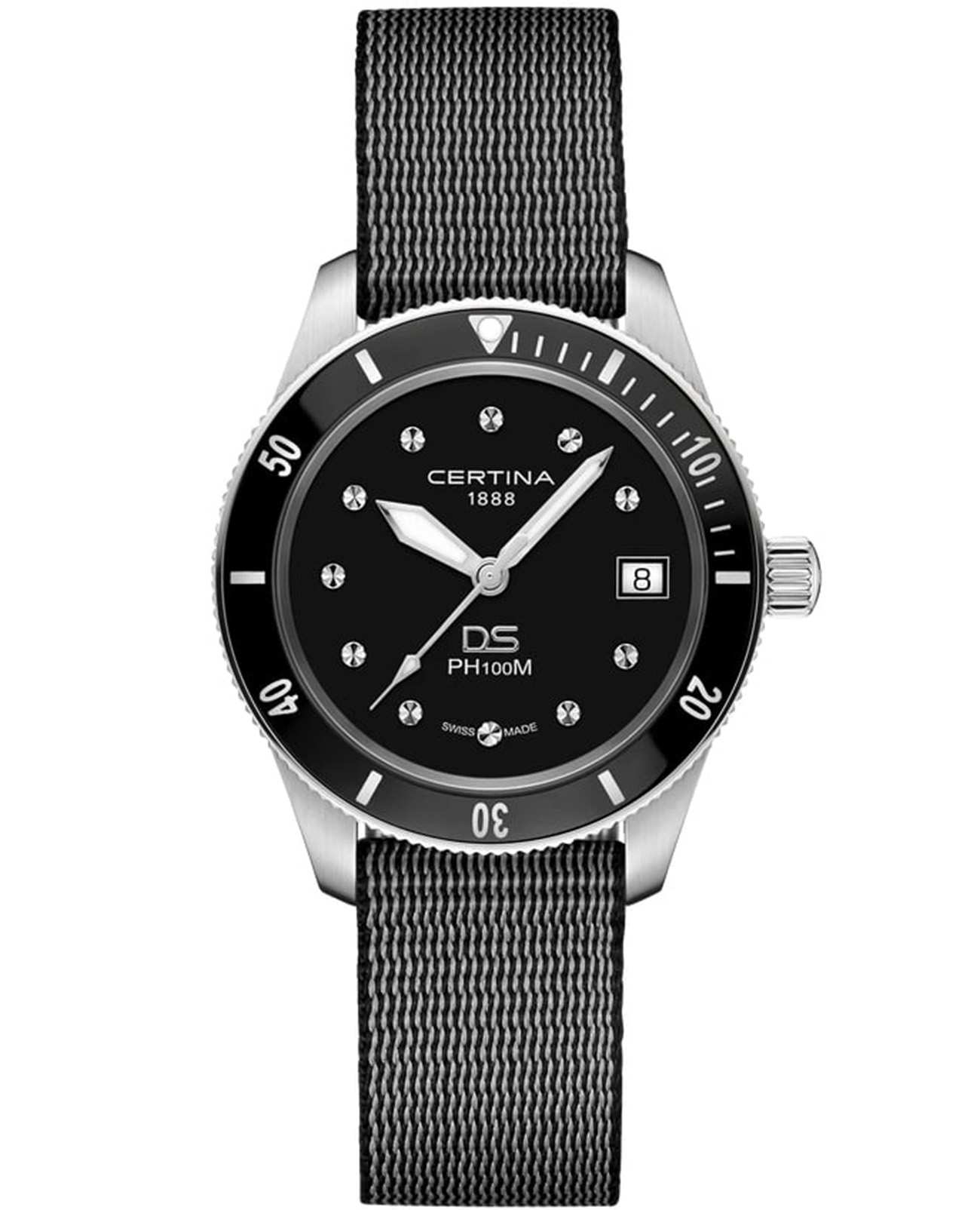 Certina DS PH100M Lady C044.210.18.051.00 – часы для поклонников ярких аксессуаров. Корпус изготовлен из высококачественной нержавеющей стали 316L с . Под твердым сапфировым стекломСапфировое стеклоПрочный и надёжный материал из кристалла сапфира синтетического происхождения, характеризующийся особой твёрдостью и устойчивостью к царапинам и повреждениям. с антибликовым покрытиемАнтибликовое покрытиеСлой оксида металла в 0,13-0,3 микрон, благодаря которому стекло часов не бликует и не отражает свет. Антибликовое покрытие уменьшает отражение света в 10 раз, обеспечивая отличную читаемость показателей циферблата. находится черный циферблат на котором вы найдете окошко даты в положении 3 часа, а также маркировку, покрытую люминесцентным покрытиемЛюминесцентное покрытиеПозволяет считывать показания времени в темноте. Производители наносят на стрелки, часовые индексы, безель или поверхность циферблата светонакопительный состав, дающий холодное свечение. Super-LumiNova. Класс водозащиты: 100 метров, позволит плавать, нырять и заниматься другими водными видами спорта. Тканевый ремешок. БезельБезельВнешний ободок, закрепляющий стекло. В спортивных часах так называется поворотное кольцо с делениями на циферблате, выполняет роль таймера – замеряет отрезки времени на шкале. Неподвижный безель – элемент декора. Однонаправленно вращающийся безель на дайверских часах позволяет фиксировать моменты погружения и выныривания на поверхность. из нержавеющей стали с PVD-покрытиемPVDУльтратонкое покрытие наносится в технике вакуумного напыления, сочетает в себе нитрид титана особой прочности со слоем золота или оксида хрома. Несёт в себе декоративную или защитную функцию.