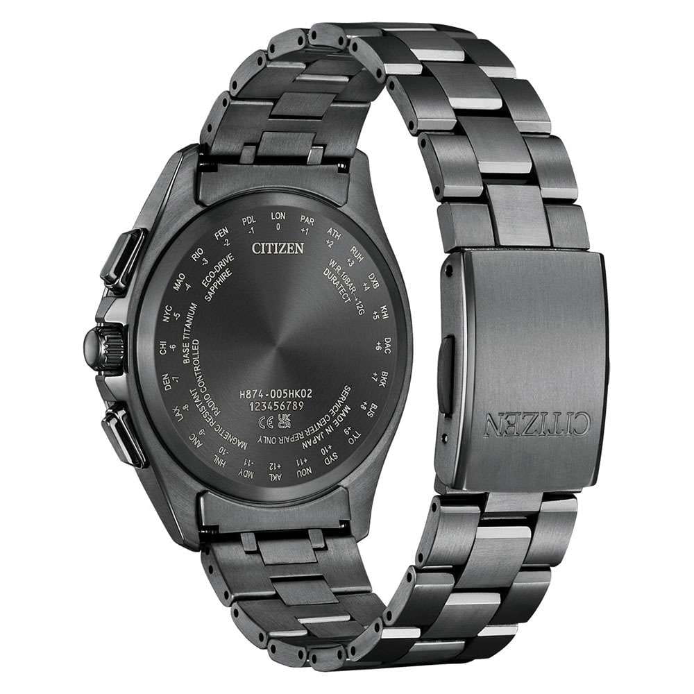 Часы Citizen BY1006-62E — это гармоничное сочетание современного японского стиля, передовых технологий и высокого уровня надежности. Модель выполнена в прочном и легком корпусе из инновационного суперлегкого титана Super Titanium Duratect TIC с черным DLC-покрытиемDLC-покрытиеDiamond like carbon - одно из лучших видов покрытия, представляющее собой углерод с алмазными свойствами. На поверхность материала наносятся распавшиеся молекулы углерода, превращающиеся в плёнку из алмазоподобных связей, которая перенимает твёрдость алмаза. диаметром 41,5 мм и толщиной 10,8 мм, дополненном браслетом шириной 22 мм с удобной раскладной застёжкойРаскладная застёжкаТакой тип застёжки используется только на браслетах из металла. Она никогда не раскрывается полностью, происходит разделение на 2 и более частей. Раскладывающая застёжка снизит вероятность потери часов к минимуму.. Кварцевый механизм калибра Citizen H874 оснащен системой Eco-Drive, которая работает на солнечной энергии, не требуя замены батарейки, и обеспечивает запас хода до 180 дней. Часы отличаются высокой точностью хода — отклонение составляет всего +/- 15 секунд в месяц. Среди функциональных особенностей — автоматическая настройка времени по радиосигналу для Германии, Японии, США и Китая, вечный календарь, функция мирового времениМировое время Полезное часовое усложнение, отображающее время в основных городах и известных областях по всему миру, оно связано с часовыми поясами, удобно для путешественников и бизнесменов. , 12/24-часовой формат, автоматическое переключение летнего и зимнего времени, а также уникальный полностью автоматизированный радиоуправляемый механизм определения фаз Луны с возможностью отображения как для северного, так и южного полушария. На черном циферблате расположена апертура даты в положении 4 часа, все стрелки с люминесцентным покрытиемЛюминесцентное покрытиеПозволяет считывать показания времени в темноте. Производители наносят на стрелки, часовые индексы, безель или поверхность циферблата светонакопительный состав, дающий холодное свечение. для отличной читаемости в любое время суток. Устойчивое к царапинам сапфировое стеклоСапфировое стеклоПрочный и надёжный материал из кристалла сапфира синтетического происхождения, характеризующийся особой твёрдостью и устойчивостью к царапинам и повреждениям. с антибликовым покрытиемАнтибликовое покрытиеСлой оксида металла в 0,13-0,3 микрон, благодаря которому стекло часов не бликует и не отражает свет. Антибликовое покрытие уменьшает отражение света в 10 раз, обеспечивая отличную читаемость показателей циферблата. надежно защищает циферблат. Водозащита уровня WR 100 позволяет использовать часы при плавании без погружения.