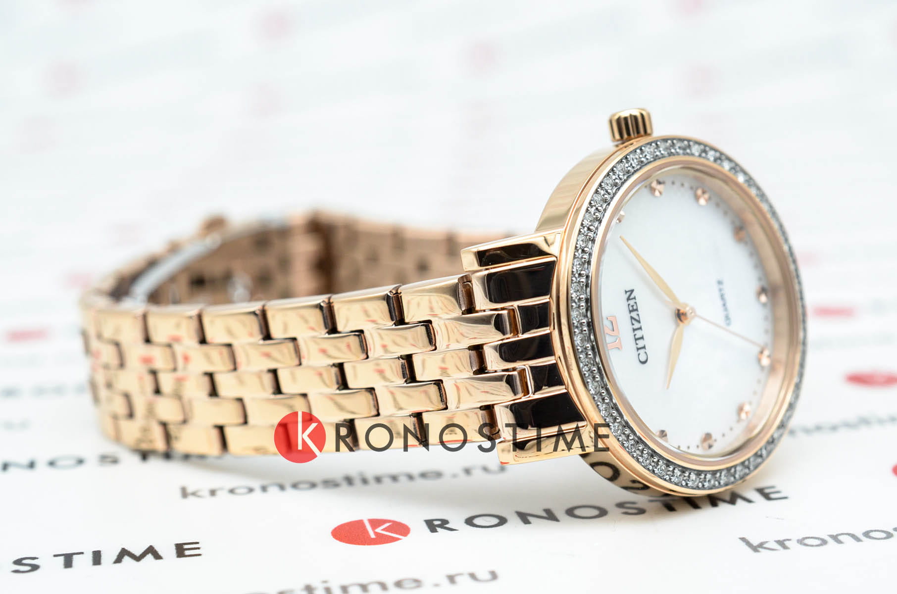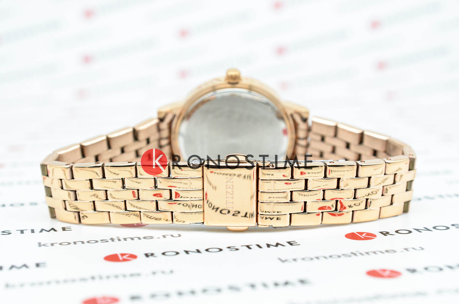 Часы Citizen EL3108-53D представляют собой элегантную модель, выполненную в Японии, сочетающую в себе современные технологии и утончённый дизайн. Корпус и браслет изготовлены из прочной нержавеющей стали с золотистым IP-покрытиемIP-покрытиеМетод ионного напыления. Демонстрирует повышенную устойчивость к истиранию, окислению и химическим веществам. Под воздействием высокого давления и температуры около 1500°C молекулы металла надёжно соединяются с частицами корпуса часов., что обеспечивает долговечность и привлекательный внешний вид. Диаметр корпуса составляет 31 мм, а толщина — всего 7 мм, что делает часы изящными и аккуратными на запястье. Особое внимание привлекает безельБезельВнешний ободок, закрепляющий стекло. В спортивных часах так называется поворотное кольцо с делениями на циферблате, выполняет роль таймера – замеряет отрезки времени на шкале. Неподвижный безель – элемент декора. Однонаправленно вращающийся безель на дайверских часах позволяет фиксировать моменты погружения и выныривания на поверхность., украшенный мерцающими кристаллами, которые придают часам особый шарм и изысканность. Надёжный кварцевый механизм гарантирует точность хода, а водозащита уровня WR 50 позволяет не снимать часы при мытье рук или во время дождя. Перламутровый циферблат украшен часовыми индексами в виде точек и цифр, а также оснащён центральными стрелками часов, минут и секунд для удобного считывания времени и кристаллами. Минеральное стеклоМинеральное стеклоМинеральное стекло представляет собой искусственно выращенный минерал кварца. Такое стекло отличается особой устойчивостью к повреждениям и царапинам. Уступает по некоторым качествам сапфировому стеклу. устойчиво к появлению мелких царапин, сохраняя прозрачность и презентабельный вид. Стальной браслет с золотистым IP-покрытиемIP-покрытиеМетод ионного напыления. Демонстрирует повышенную устойчивость к истиранию, окислению и химическим веществам. Под воздействием высокого давления и температуры около 1500°C молекулы металла надёжно соединяются с частицами корпуса часов. и раскладной застёжкойРаскладная застёжкаТакой тип застёжки используется только на браслетах из металла. Она никогда не раскрывается полностью, происходит разделение на 2 и более частей. Раскладывающая застёжка снизит вероятность потери часов к минимуму. надежно фиксирует часы на запястье, обеспечивая комфорт при ежедневном ношении.