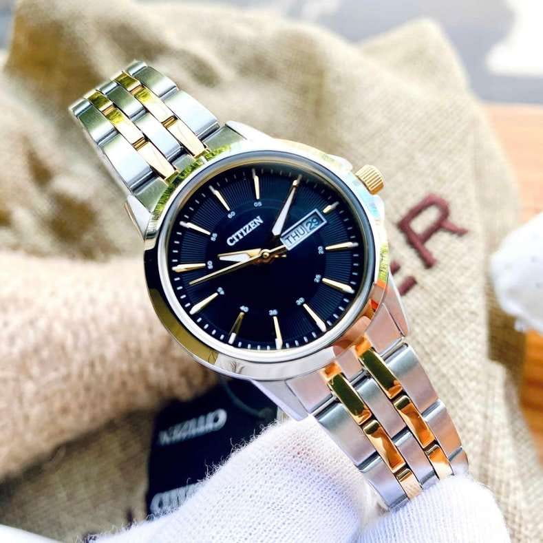 Часы Citizen EQ0608-55E выполнены в классическом стиле и станут отличным выбором для тех, кто ценит элегантность и надежность в каждом элементе. Модель оснащена точным японским кварцевым механизмом Citizen 1002, обеспечивающим стабильную работу и точный ход. Корпус диаметром 28 мм и толщиной 8 мм изготовлен из нержавеющей стали, что придаёт часам благородный оттенок и долговечность. Браслет, выполненный из стали с частичным золотистым IP-покрытиемIP-покрытиеМетод ионного напыления. Демонстрирует повышенную устойчивость к истиранию, окислению и химическим веществам. Под воздействием высокого давления и температуры около 1500°C молекулы металла надёжно соединяются с частицами корпуса часов. и оснащённый раскладной застёжкойРаскладная застёжкаТакой тип застёжки используется только на браслетах из металла. Она никогда не раскрывается полностью, происходит разделение на 2 и более частей. Раскладывающая застёжка снизит вероятность потери часов к минимуму. с системой блокировки, обеспечивает надежную фиксацию на запястье. Циферблат черного цвета украшен стрелками с люминесцентным покрытиемЛюминесцентное покрытиеПозволяет считывать показания времени в темноте. Производители наносят на стрелки, часовые индексы, безель или поверхность циферблата светонакопительный состав, дающий холодное свечение. для удобного считывания времени даже в условиях недостаточного освещения. Минеральное стеклоМинеральное стеклоМинеральное стекло представляет собой искусственно выращенный минерал кварца. Такое стекло отличается особой устойчивостью к повреждениям и царапинам. Уступает по некоторым качествам сапфировому стеклу. защищает часы от случайных царапин, а водозащита уровня 30WR позволяет не бояться случайных брызг или дождя. На циферблате также расположен календарь с отображением даты и дня недели, что делает модель ещё более функциональной. Заводная головка снабжена защитой, что повышает комфорт и безопасность использования.