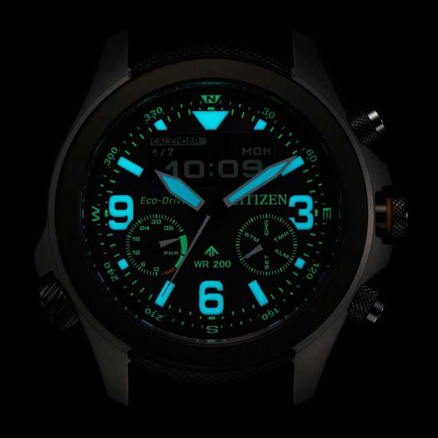 Citizen Promaster JV1007-07E часы-хронографХронографФункция позволяет измерять отрезки времени с особой точностью: часы, минуты, секунды. Верным признаком хронографа является наличие на циферблате 3 дополнительных окошек-счётчиков. с секундомеромСекундомерСекундоме́р — прибор, способный измерять интервалы времени с точностью до долей секунды. спортивного дизайна с высоким уровнем водозащиты. Корпус из нержавеющей стали диаметром 43,9 мм идеально сбалансирован. Сапфировое стеклоСапфировое стеклоПрочный и надёжный материал из кристалла сапфира синтетического происхождения, характеризующийся особой твёрдостью и устойчивостью к царапинам и повреждениям. с антибликовым покрытием обеспечивает отличную защиту циферблата от царапин. Часы работают на основе кварцевого механизма, питание от солнечной энергии, запас энергии на 360 дней. Время работы при полной зарядке и включенной функции сохранения энергии до 3 лет. Полиуретановый ремешок на стандартной застежке идеально дополняют дизайн часов, обеспечивая комфортное ношение. Стрелки и метки на циферблате имеют люминесцентное покрытиеЛюминесцентное покрытиеПозволяет считывать показания времени в темноте. Производители наносят на стрелки, часовые индексы, безель или поверхность циферблата светонакопительный состав, дающий холодное свечение. позволяющее легко определять время даже в темноте. LCD дисплей с светодиодной подсветкойСветодиодная подсветкаСветодиодная или LED-подсветка обеспечивает появление яркого холодного свечения за счёт LED-элементов - маленьких лампочек. Они потребляют минимальное количество энергии, чаще всего можно встретить 1 светодиод, в нижней части циферблата.. Вращающийся внутренний безельБезельВнешний ободок, закрепляющий стекло. В спортивных часах так называется поворотное кольцо с делениями на циферблате, выполняет роль таймера – замеряет отрезки времени на шкале. Неподвижный безель – элемент декора. Однонаправленно вращающийся безель на дайверских часах позволяет фиксировать моменты погружения и выныривания на поверхность. с IP-покрытиемIP-покрытиеМетод ионного напыления. Демонстрирует повышенную устойчивость к истиранию, окислению и химическим веществам. Под воздействием высокого давления и температуры около 1500°C молекулы металла надёжно соединяются с частицами корпуса часов. со шкалой компаса. Функция индикации заряда (EOL) и предотвращения перезарядки. Мировое времяМировое время Полезное часовое усложнение, отображающее время в основных городах и известных областях по всему миру, оно связано с часовыми поясами, удобно для путешественников и бизнесменов. - 43 города (29 часовых поясов), переход на зимнее и летнее время. Сплит-хронографСплит-хронографИспользуется для измерения продолжительности нескольких временных отрезков, начинающихся одновременно, а заканчивающихся в разное время.. ТаймерТаймерОтсчитывает секунды в обратном направлении в заданном интервале времени. обратного отсчета до 100мин. Всемирное координированное время UTCUTCВсемирное кординационное время, не имеющее привязки к географическому положению Гринвича, основывается на атомном отсчёте времени. Регулировка времени осуществляется более точно, чем устаревшее GMT.