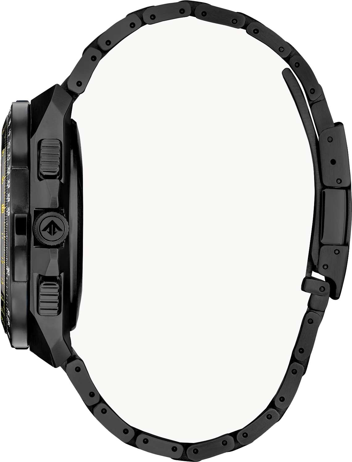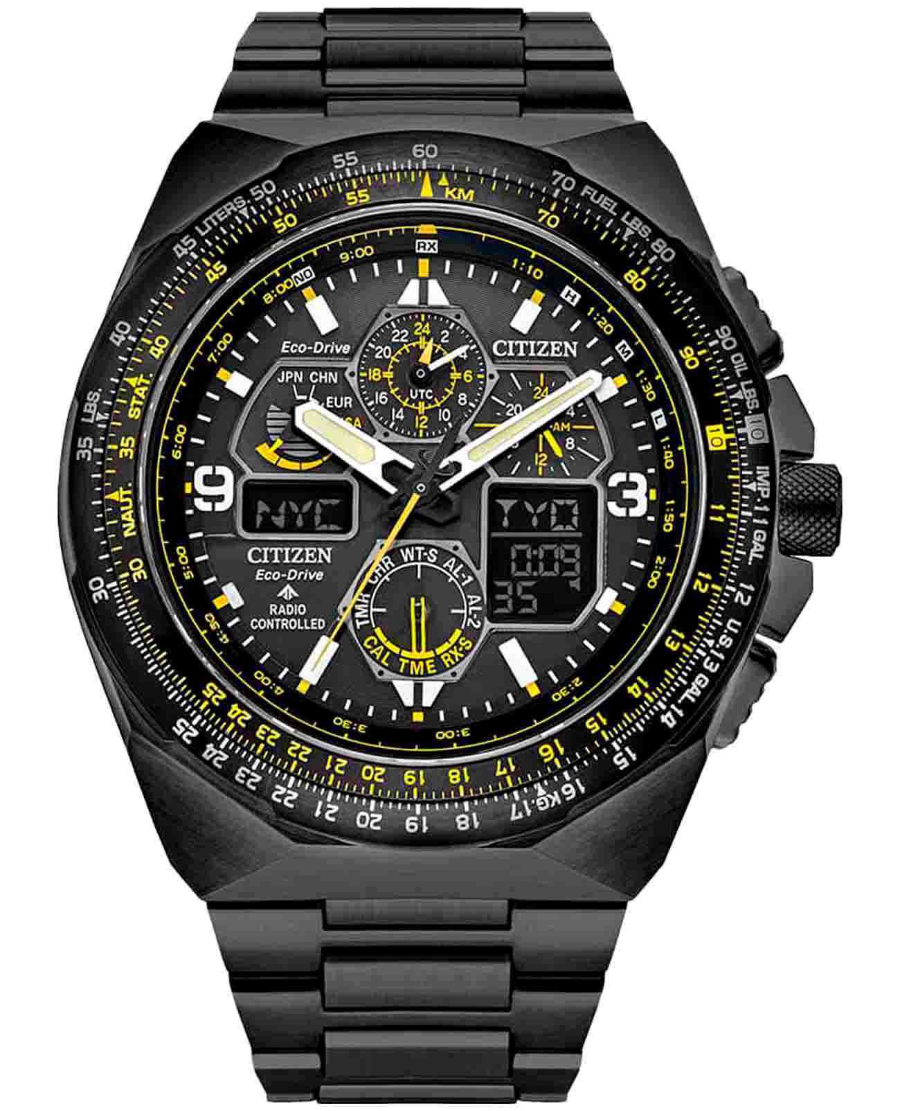 Citizen Promaster JY8127-59E часы-хронографХронографФункция позволяет измерять отрезки времени с особой точностью: часы, минуты, секунды. Верным признаком хронографа является наличие на циферблате 3 дополнительных окошек-счётчиков. с секундомеромСекундомерСекундоме́р — прибор, способный измерять интервалы времени с точностью до долей секунды. спортивного дизайна с высоким уровнем водозащиты. Корпус из нержавеющей стали с IP-покрытиемIP-покрытиеМетод ионного напыления. Демонстрирует повышенную устойчивость к истиранию, окислению и химическим веществам. Под воздействием высокого давления и температуры около 1500°C молекулы металла надёжно соединяются с частицами корпуса часов. диаметром 45,7 мм идеально сбалансирован. Сапфировое стеклоСапфировое стеклоПрочный и надёжный материал из кристалла сапфира синтетического происхождения, характеризующийся особой твёрдостью и устойчивостью к царапинам и повреждениям. с антибликовым покрытием обеспечивает отличную защиту циферблата от царапин. Часы работают на основе кварцевого механизма, питание от солнечной энергии. Стальной браслет на раскладной застёжкеРаскладная застёжкаТакой тип застёжки используется только на браслетах из металла. Она никогда не раскрывается полностью, происходит разделение на 2 и более частей. Раскладывающая застёжка снизит вероятность потери часов к минимуму. идеально дополняют дизайн часов, обеспечивая комфортное ношение. Стрелки и метки на циферблате имеют люминесцентное покрытиеЛюминесцентное покрытиеПозволяет считывать показания времени в темноте. Производители наносят на стрелки, часовые индексы, безель или поверхность циферблата светонакопительный состав, дающий холодное свечение. позволяющее легко определять время даже в темноте. Поворотный безельБезельВнешний ободок, закрепляющий стекло. В спортивных часах так называется поворотное кольцо с делениями на циферблате, выполняет роль таймера – замеряет отрезки времени на шкале. Неподвижный безель – элемент декора. Однонаправленно вращающийся безель на дайверских часах позволяет фиксировать моменты погружения и выныривания на поверхность.. Автоматический прием сигналов от радиовышек, расположенных в различных точках земного шара, которые передают временные сигналы от определенных атомных часов. Коррекция текущего времени радиосигналом на территории почти всей Европы, США, Японии и Китая. Функция индикации заряда (EOL) и предотвращения перезарядки. Мировое времяМировое время Полезное часовое усложнение, отображающее время в основных городах и известных областях по всему миру, оно связано с часовыми поясами, удобно для путешественников и бизнесменов. - 43 города, переход на зимнее и летнее время. Всемирное координированное время UTCUTCВсемирное кординационное время, не имеющее привязки к географическому положению Гринвича, основывается на атомном отсчёте времени. Регулировка времени осуществляется более точно, чем устаревшее GMT.