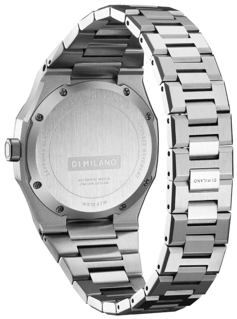 Часы D1 Milano Beryl Code ATBU02 – стильный аксессуар для современных мужчин и женщин. Часы механические с автоподзаводом. Корпус выполнен из прочной нержавеющей стали 316L, а зеленый циферблат украшен простыми штрихами вместо цифр. Стрелки с люминесцентным покрытиемЛюминесцентное покрытиеПозволяет считывать показания времени в темноте. Производители наносят на стрелки, часовые индексы, безель или поверхность циферблата светонакопительный состав, дающий холодное свечение.. Задняя крышка закреплена на 8 винтах, что обеспечивает надежность конструкции. Стальной браслет на скрытой раскладной застёжкеРаскладная застёжкаТакой тип застёжки используется только на браслетах из металла. Она никогда не раскрывается полностью, происходит разделение на 2 и более частей. Раскладывающая застёжка снизит вероятность потери часов к минимуму.. Часы имеют водозащиту 100 метров (100WR), что позволит плавать, нырять и заниматься другими водными видами спорта. Часы сочетают в себе классический дизайн и современные технологии производства.