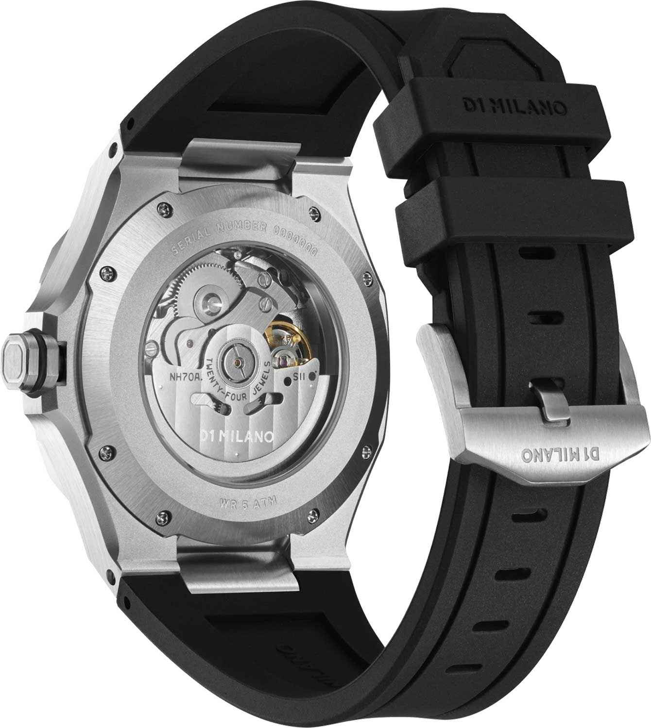 Часы D1 Milano SKRJ10 — это эффектные механические мужские часы, разработанные для ценителей уникальных аксессуаров. Их утонченный дизайн и высокое качество исполнения делают эти часы незаменимым элементом вашего стиля. Изготовленные в Италии, они оснащены надежным механизмом Seiko TMI NH70-L с автоподзаводом, обеспечивающими запас хода до 41 часа. Частота работы механизма составляет 21600 полуколебаний в час. Часы имеют корпус из нержавеющей стали 316L, что гарантирует долговечность и стойкость к внешним воздействиям. Черный скелетонизированный циферблат защищен сапфировым стекломСапфировое стеклоПрочный и надёжный материал из кристалла сапфира синтетического происхождения, характеризующийся особой твёрдостью и устойчивостью к царапинам и повреждениям. с антибликовым покрытием, подчеркивающим элегантность и изысканность модели. Метки в виде штрихов и прозрачная задняя крышка, закрепленная на 8 винтах, придают часам особый шарм. Резиновый ремешок черного цвета со стандартной застежкой обеспечивает комфортное и надежное ношение. Водозащита до 50 метров делает эти часы подходящими для повседневного использования.