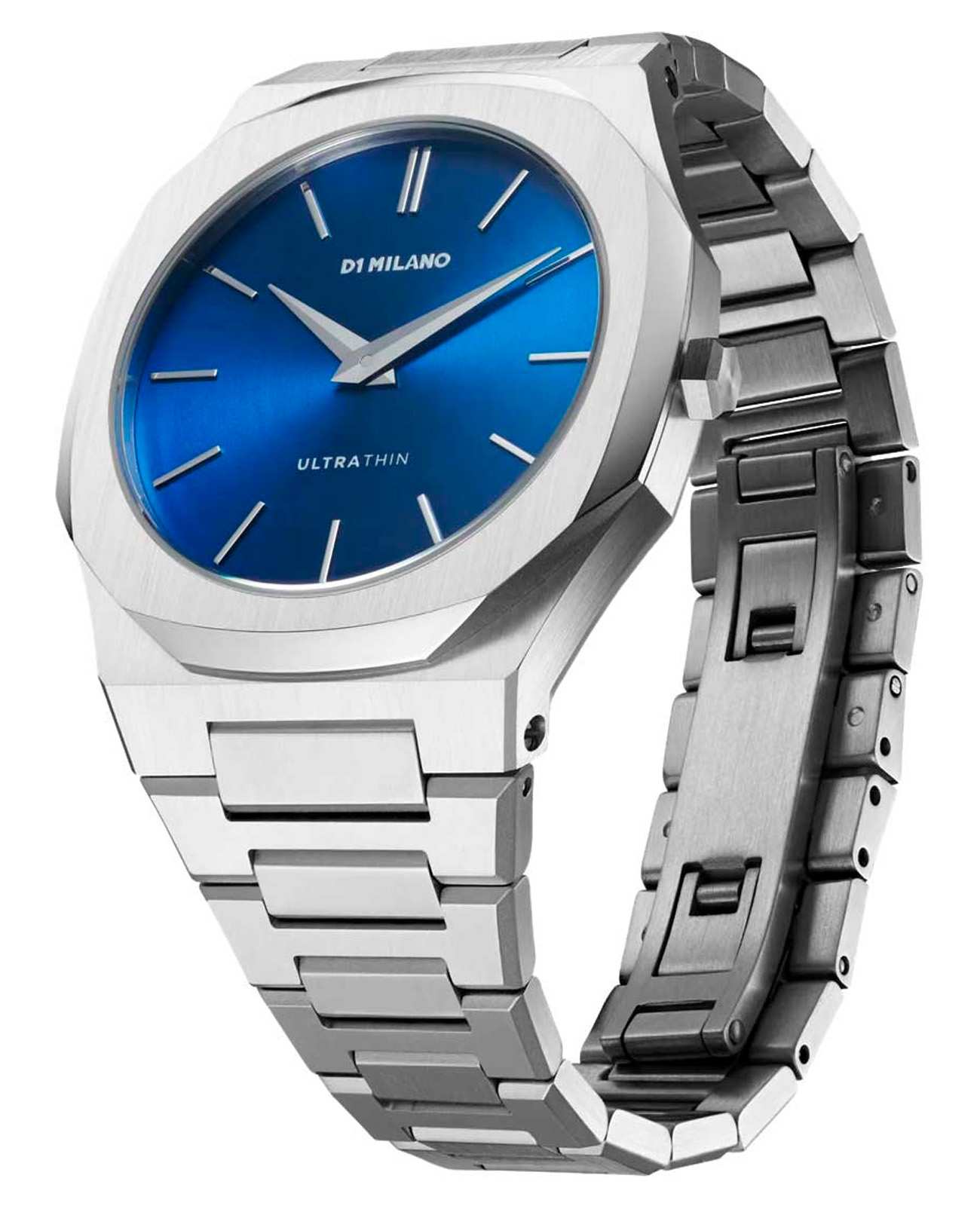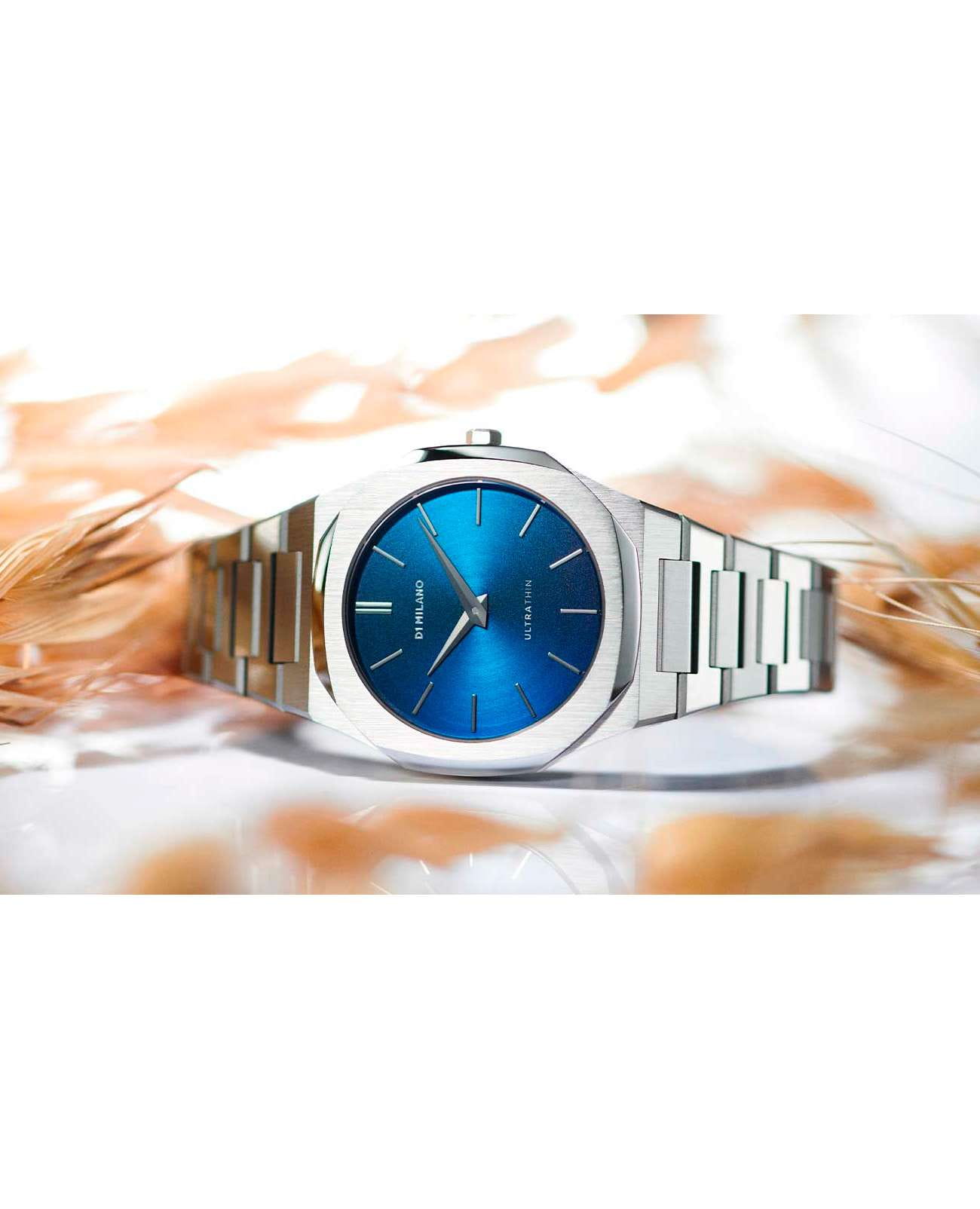 Наручные часы D1 Milano UTBL21 из коллекции Ultra Thin Mini Geo сочетают в себе элегантный дизайн и современные технологии. Модель обладает круглым корпусом диаметром 34 мм, изготовленным из нержавеющей стали, что обеспечивает высокую устойчивость к внешним воздействиям. Для защиты циферблата используется сапфировое стеклоСапфировое стеклоПрочный и надёжный материал из кристалла сапфира синтетического происхождения, характеризующийся особой твёрдостью и устойчивостью к царапинам и повреждениям., которое эффективно противостоит царапинам и механическим повреждениям. Часы оснащены кварцевым механизмом Miyota 1L22, гарантирующим точное время без необходимости подзаводки. Водонепроницаемость модели достигает 5 атмосфер (50 метров), что позволяет использовать их при контакте с водой, например, во время мытья рук или дождя. Браслет выполнен из нержавеющей стали с раскладной застежкойРаскладной замокДанный вариант застежки используется только на часах с металлическим браслетом. Отличительная особенность такого крепления в том, что длина браслета становится универсальной и вы можете самостоятельно отрегулировать нужный вам размер – застежка просто двигается по браслету часов., обеспечивающей комфортное ношение и безопасность. Циферблат синего цвета с метками в виде штрихов, что придает часам особую изысканность и делает их идеальным выбором для повседневного использования или особых случаев.