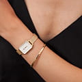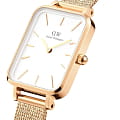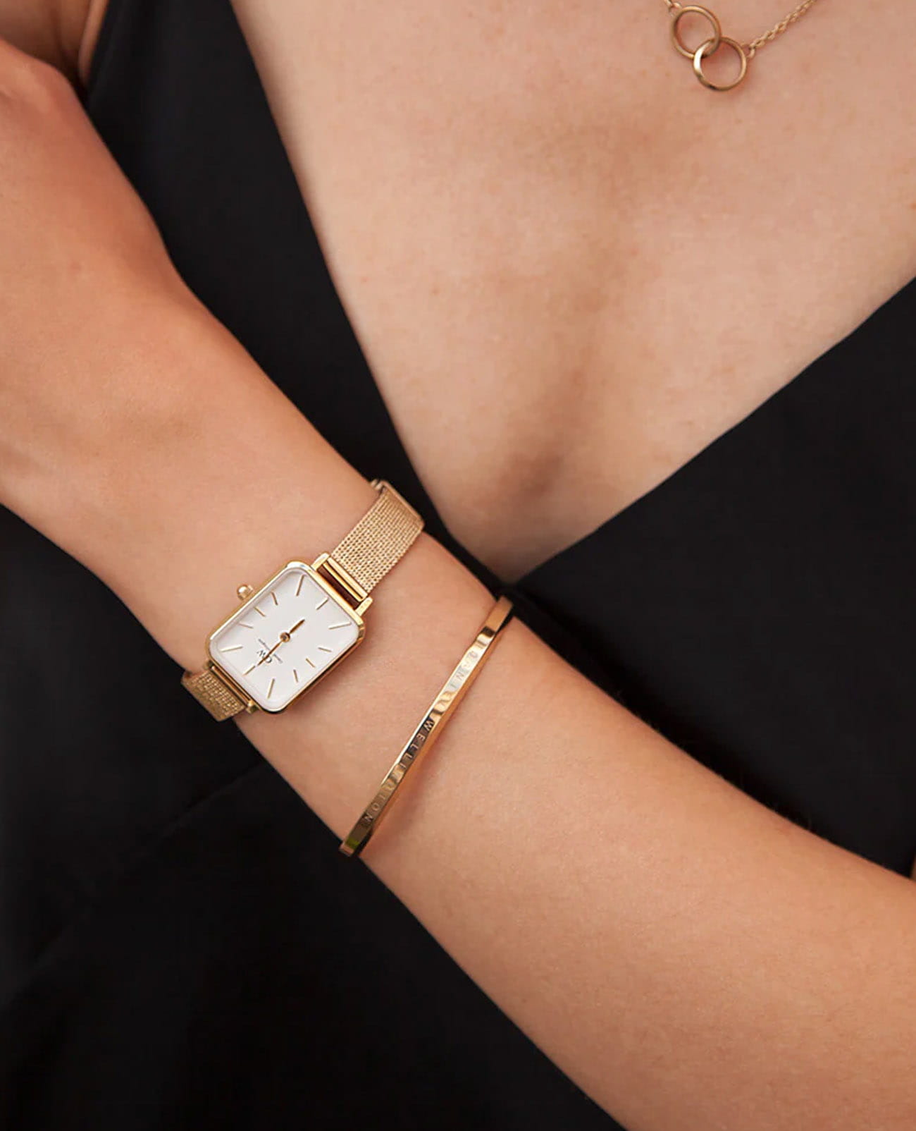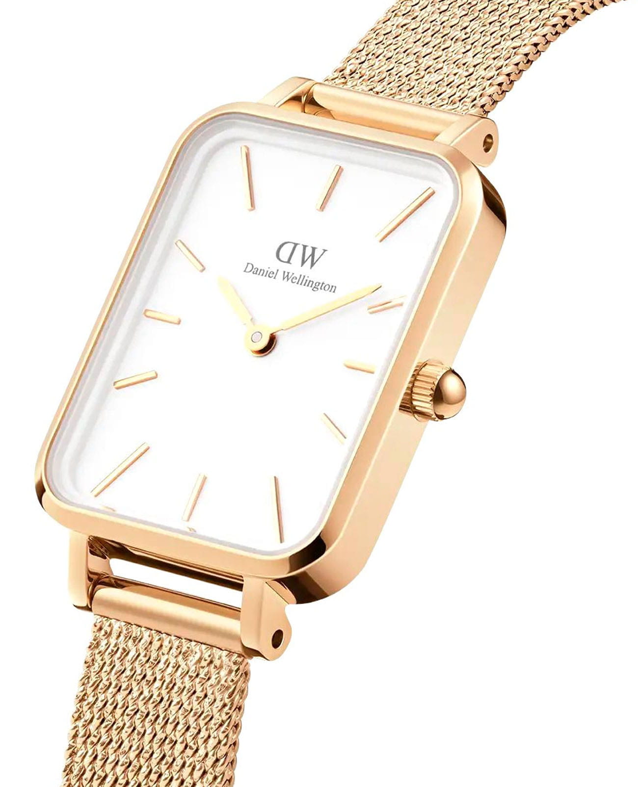 Женские наручные часы с минеральным стекломМинеральное стеклоМинеральное стекло представляет собой искусственно выращенный минерал кварца. Такое стекло отличается особой устойчивостью к повреждениям и царапинам. Уступает по некоторым качествам сапфировому стеклу. Daniel Wellington Quadro Pressed Evergold DW00100556, кварцевый механизм с высокой точностью. Корпус часов изготовлен из стали с PVD-покрытиемPVDУльтратонкое покрытие наносится в технике вакуумного напыления, сочетает в себе нитрид титана особой прочности со слоем золота или оксида хрома. Несёт в себе декоративную или защитную функцию.. Циферблат украшен фирменным логотипом Daniel Wellington. Накладные метки в виде штрихов. Рифленая заводная головка. Индивидуальный серийный номер. Класс водозащиты: 30 метров, позволит защитить корпус от случайных брызг или капель дождя. Стальной браслет миланского плетения с PVD-покрытиемPVDУльтратонкое покрытие наносится в технике вакуумного напыления, сочетает в себе нитрид титана особой прочности со слоем золота или оксида хрома. Несёт в себе декоративную или защитную функцию. на раскладном замкеРаскладной замокДанный вариант застежки используется только на часах с металлическим браслетом. Отличительная особенность такого крепления в том, что длина браслета становится универсальной и вы можете самостоятельно отрегулировать нужный вам размер – застежка просто двигается по браслету часов..
