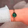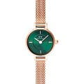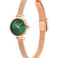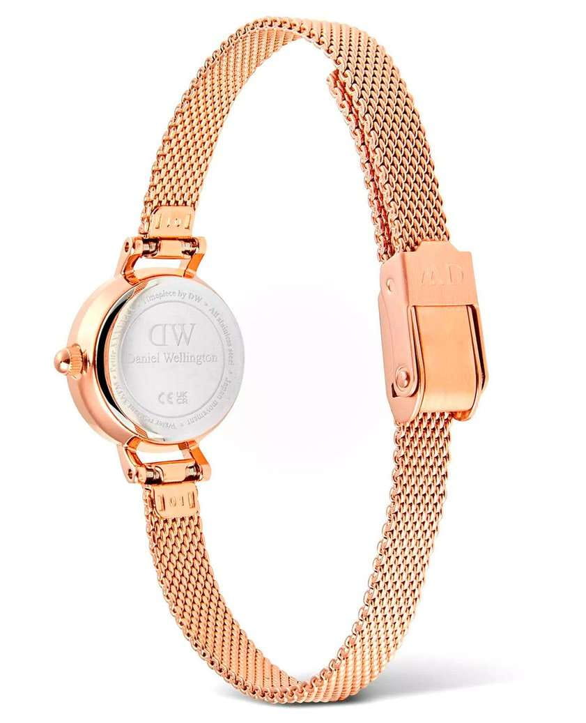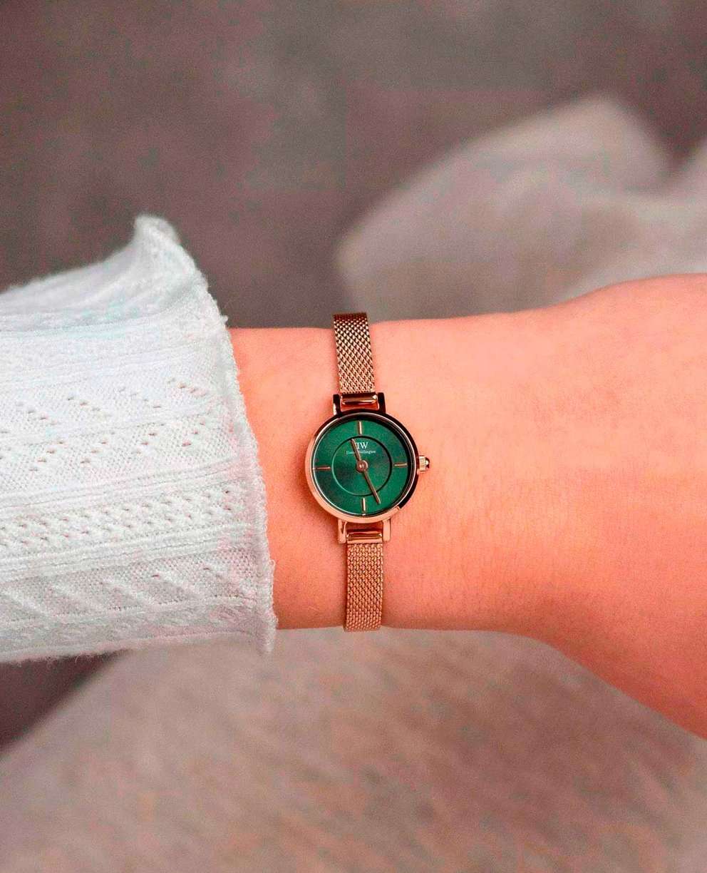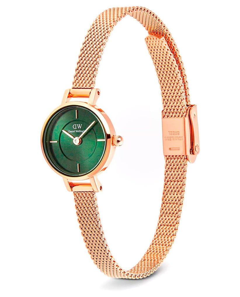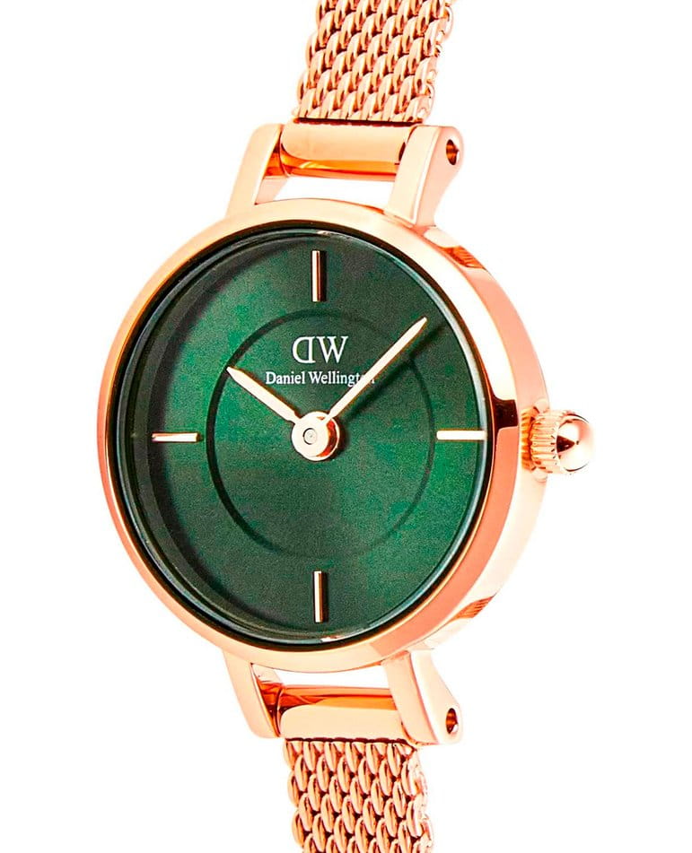 Женские наручные часы Daniel Wellington Petite Mini Emerald Melrose DW00100742 представляют собой элегантный аксессуар с классическим дизайном . Модель обладает круглым корпусом диаметром 19 мм, выполненным из нержавеющей стали 316L с PVD-покрытиемPVDУльтратонкое покрытие наносится в технике вакуумного напыления, сочетает в себе нитрид титана особой прочности со слоем золота или оксида хрома. Несёт в себе декоративную или защитную функцию. розового золота, что обеспечивает высокую устойчивость к внешним воздействиям и придает изделию премиальный вид . Браслет из того же материала в миланском плетении на раскладном замкеРаскладной замокДанный вариант застежки используется только на часах с металлическим браслетом. Отличительная особенность такого крепления в том, что длина браслета становится универсальной и вы можете самостоятельно отрегулировать нужный вам размер – застежка просто двигается по браслету часов.. Циферблат зеленого цвета дополнен тонкими стрелками и индексами в тон корпуса, создавая гармоничный и изысканный образ . Для защиты используется минеральное стеклоМинеральное стеклоМинеральное стекло представляет собой искусственно выращенный минерал кварца. Такое стекло отличается особой устойчивостью к повреждениям и царапинам. Уступает по некоторым качествам сапфировому стеклу., устойчивое к царапинам и механическим повреждениям . Часы работают на японском кварцевом механизме, обеспечивающем высокую точность хода . Водонепроницаемость модели составляет 30 метров / 3 ATM, что позволяет использовать их в повседневных условиях, например, при мытье рук или в дождь, но не рекомендуется для плавания . Тонкий корпус часов (всего 6 мм) делает их идеальным выбором для сочетания с повседневной одеждой и даже с более формальными нарядами . Простота и элегантность дизайна делают эту модель универсальным аксессуаром для женщин, ценящих стиль и функциональность .