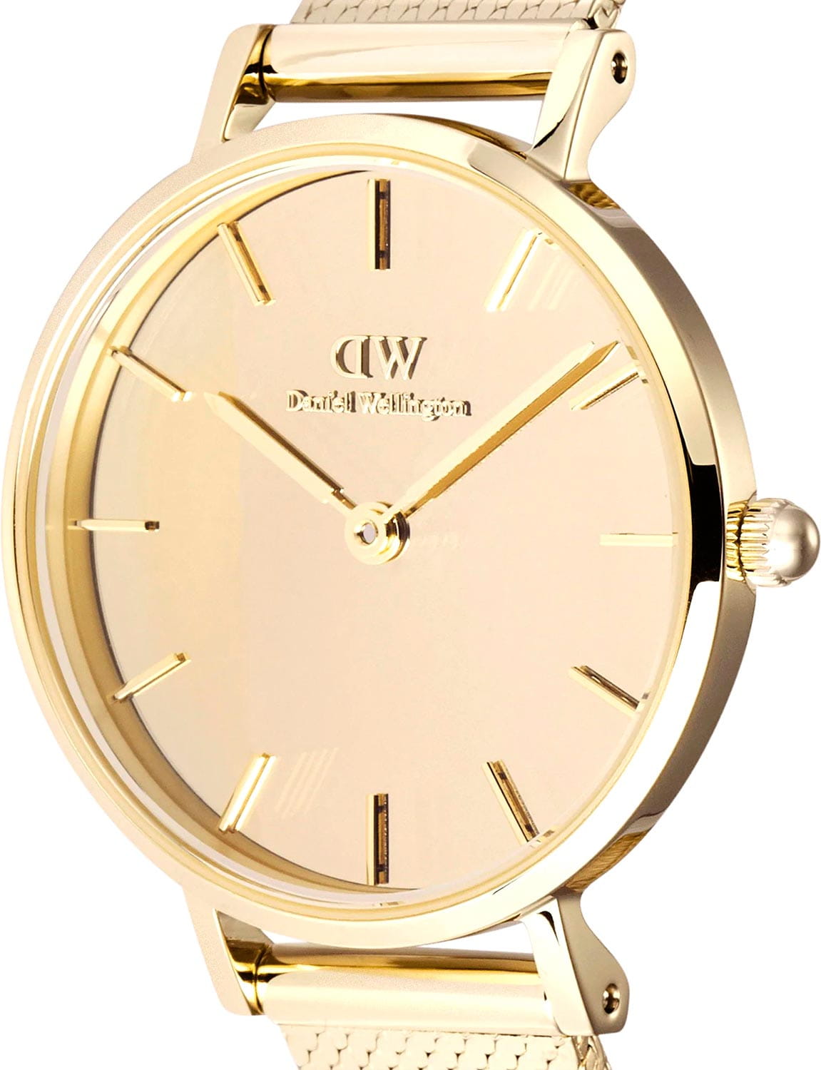 Женские наручные часы с минеральным стекломМинеральное стеклоМинеральное стекло представляет собой искусственно выращенный минерал кварца. Такое стекло отличается особой устойчивостью к повреждениям и царапинам. Уступает по некоторым качествам сапфировому стеклу. Daniel Wellington Petite Reflection Gold DW00100797, кварцевый механизм с высокой точностью. Корпус часов изготовлен из нержавеющей стали с PVD-покрытиемPVDУльтратонкое покрытие наносится в технике вакуумного напыления, сочетает в себе нитрид титана особой прочности со слоем золота или оксида хрома. Несёт в себе декоративную или защитную функцию..Накладные метки в виде штрихов. Японский кварцевый механизм. Рифленая заводная головка. Класс водозащиты: 30 метров, позволит защитить корпус от случайных брызг или капель дождя. Стальной браслет миланского плетения с PVD-покрытиемPVDУльтратонкое покрытие наносится в технике вакуумного напыления, сочетает в себе нитрид титана особой прочности со слоем золота или оксида хрома. Несёт в себе декоративную или защитную функцию. на раскладном замкеРаскладной замокДанный вариант застежки используется только на часах с металлическим браслетом. Отличительная особенность такого крепления в том, что длина браслета становится универсальной и вы можете самостоятельно отрегулировать нужный вам размер – застежка просто двигается по браслету часов..