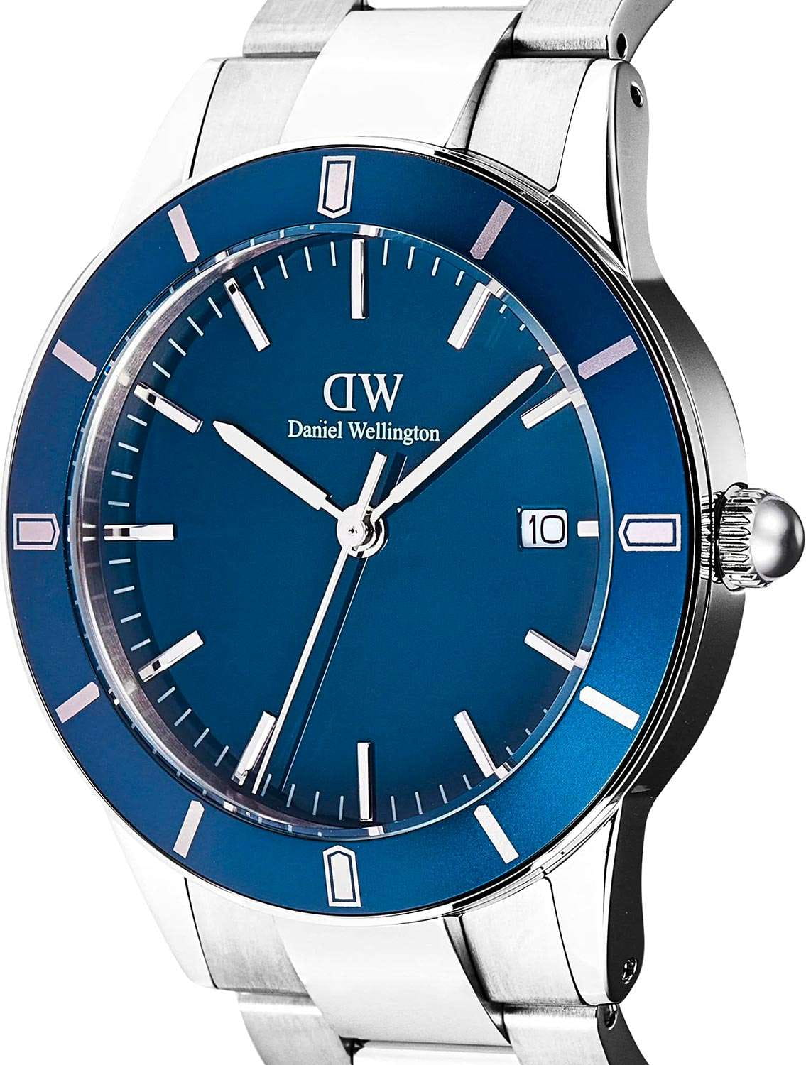 Daniel Wellington — мужские часы в современном спортивно-элегантном стиле. Круглый корпус диаметром 40 мм изготовлен из нержавеющей стали и дополнен синим безелемБезельВнешний ободок, закрепляющий стекло. В спортивных часах так называется поворотное кольцо с делениями на циферблате, выполняет роль таймера – замеряет отрезки времени на шкале. Неподвижный безель – элемент декора. Однонаправленно вращающийся безель на дайверских часах позволяет фиксировать моменты погружения и выныривания на поверхность. из анодированного алюминия, которое придаёт модели выразительный характер.
