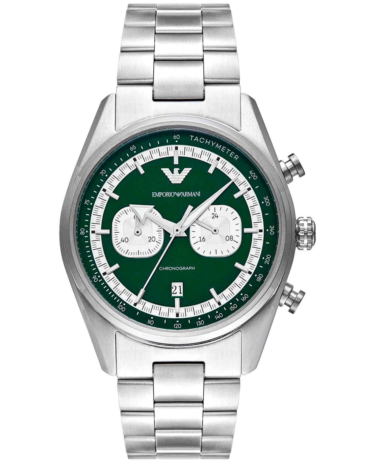 Мужские часы Emporio Armani Racer AR11637 - стильные кварцевые часы-хронографХронографФункция позволяет измерять отрезки времени с особой точностью: часы, минуты, секунды. Верным признаком хронографа является наличие на циферблате 3 дополнительных окошек-счётчиков. с секундомеромСекундомерСекундоме́р — прибор, способный измерять интервалы времени с точностью до долей секунды. сочетают в себе элегантность и функциональность, что делает их идеальным аксессуаром для современного мужчины. Корпус часов из нержавеющей стали, что обеспечивает долговечность и устойчивость к внешним воздействиям. Минеральное стеклоМинеральное стеклоМинеральное стекло представляет собой искусственно выращенный минерал кварца. Такое стекло отличается особой устойчивостью к повреждениям и царапинам. Уступает по некоторым качествам сапфировому стеклу. защищает циферблат, добавляя изысканности всей конструкции. Размер корпуса составляет 42 мм, а толщина — 11 мм, что придаёт часам солидный внешний вид, не утяжеляя при этом запястье. Часы имеют водонепроницаемость WR50 (5 атм), это позволяет использовать их в повседневной жизни, не опасаясь воздействия воды. Стальной браслет на застёжке-бабочке с кнопкамиЗастёжка "бабочка"Такой вид застёжки дополняется предохранителями, помогающими избежать случайного раскрытия браслета. Обладают изящным исполнением. обеспечивает комфортное и надёжное крепление на запястье. 12-ти и 24-х часовой формат времени добавляет практичности и удобства в использовании. ТахиметрТахиметрРазмеченная шкала, располагается на ободке или безеле часов. Тахиметр позволяет рассчитать скорость на определённом участке пути, расстояние измеряется в километрах или милях. по внешнему краю. Окошко даты находится в положении 6 часов. Стрелки с люминесцентным покрытиемЛюминесцентное покрытиеПозволяет считывать показания времени в темноте. Производители наносят на стрелки, часовые индексы, безель или поверхность циферблата светонакопительный состав, дающий холодное свечение. обеспечивают удобное считывание времени в темноте после кратковременного пребывания на свету, что делает эти часы практичными в любых условиях.