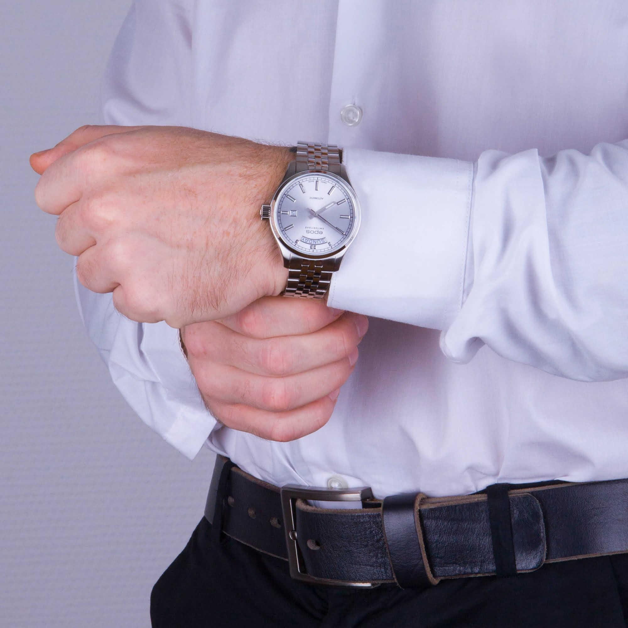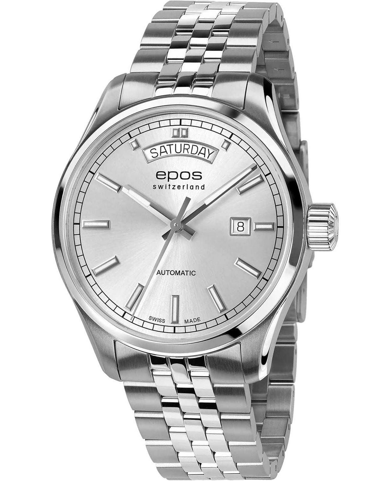Мужские механические часы с автоподзаводом Epos из коллекции Passion — это сочетание швейцарского мастерства и современного дизайна. Корпус диаметром 41 мм и толщиной 11 мм выполнен из нержавеющей стали 316L. Циферблат серебристого цвета оформлен индексами и дополнен окошками даты и дня недели. Циферблат защищён сапфировым стекломСапфировое стеклоПрочный и надёжный материал из кристалла сапфира синтетического происхождения, характеризующийся особой твёрдостью и устойчивостью к царапинам и повреждениям.. Стрелки и метки с люминесцентным покрытиемЛюминесцентное покрытиеПозволяет считывать показания времени в темноте. Производители наносят на стрелки, часовые индексы, безель или поверхность циферблата светонакопительный состав, дающий холодное свечение., обеспечивающим хорошую читаемость в темноте. Прозрачная задняя крышка позволяет наблюдать за работой механизма. Часы оснащены стальным браслетом на застёжке «бабочка» с кнопкамиЗастёжка "бабочка"Такой вид застёжки дополняется предохранителями, помогающими избежать случайного раскрытия браслета. Обладают изящным исполнением. . Водонепроницаемость 100 м позволяет использовать часы для плавания и повседневного ношения. Гарантия — 24 месяца. Универсальный выбор для ценителя механики и выразительного стиля.