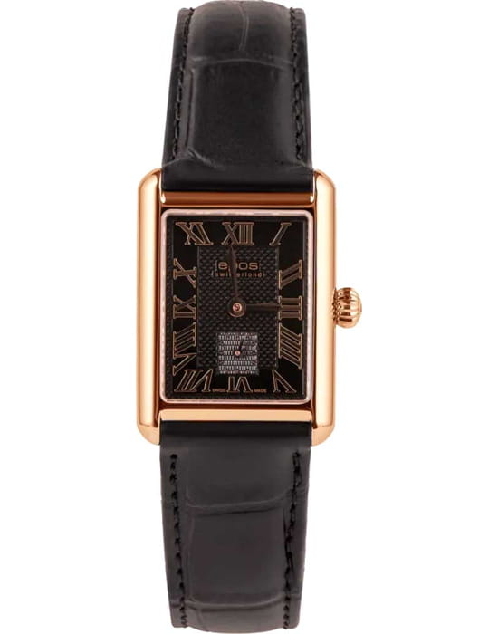 Epos 8002.702.24.25.15 — женская модель с утончённым классическим стилем и прямоугольным корпусом, выполненным из нержавеющей стали с PVD-покрытиемPVDУльтратонкое покрытие наносится в технике вакуумного напыления, сочетает в себе нитрид титана особой прочности со слоем золота или оксида хрома. Несёт в себе декоративную или защитную функцию.. Черный циферблат оформлен римскими индексами и утончённым узором «Clous de Paris», создающим игру света и подчёркивающим глубину дизайна. Защитную функцию выполняет сапфировое стеклоСапфировое стеклоПрочный и надёжный материал из кристалла сапфира синтетического происхождения, характеризующийся особой твёрдостью и устойчивостью к царапинам и повреждениям., стойкое к царапинам и сохраняющее прозрачность. В основе лежит швейцарский автоматический механизм, обеспечивающий стабильность и точность хода. Функции включают индикацию часов, минут и малую секундную шкалу, расположенную в позиции «6 часов». Часы дополнены кожаным ремешком, который гармонично завершает строгий образ модели.