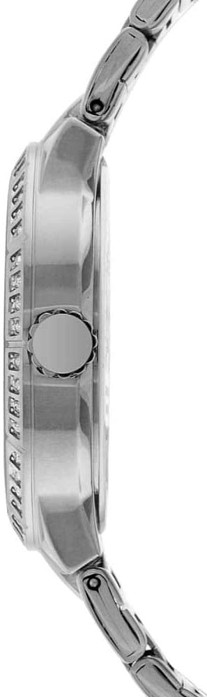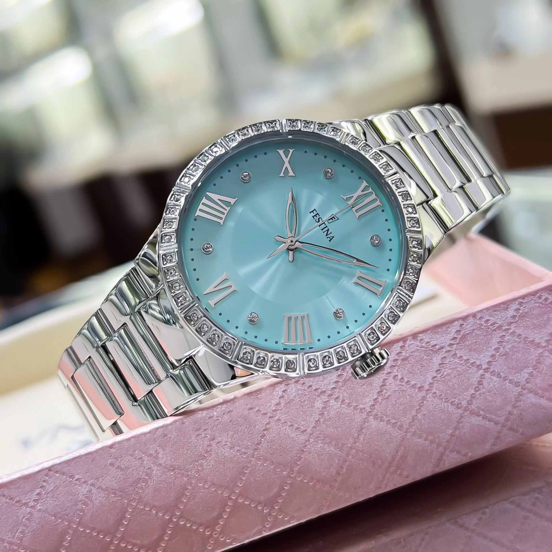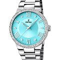 Женские кварцевые часы с минеральным стекломМинеральное стеклоМинеральное стекло представляет собой искусственно выращенный минерал кварца. Такое стекло отличается особой устойчивостью к повреждениям и царапинам. Уступает по некоторым качествам сапфировому стеклу. Festina Boyfriend F16719/4, кварцевый механизм с высокой точностью. Класс водозащиты: 50 метров, позволит защитить корпус от случайных брызг или капель дождя. Корпус часов изготовлен из стали. Стальной браслет на раскладной застёжкеРаскладная застёжкаТакой тип застёжки используется только на браслетах из металла. Она никогда не раскрывается полностью, происходит разделение на 2 и более частей. Раскладывающая застёжка снизит вероятность потери часов к минимуму.. Циферблат инкрустирован цирконами. Метки в виде точек (цирконы) и римских цифр. Рифленая заводная головка.