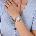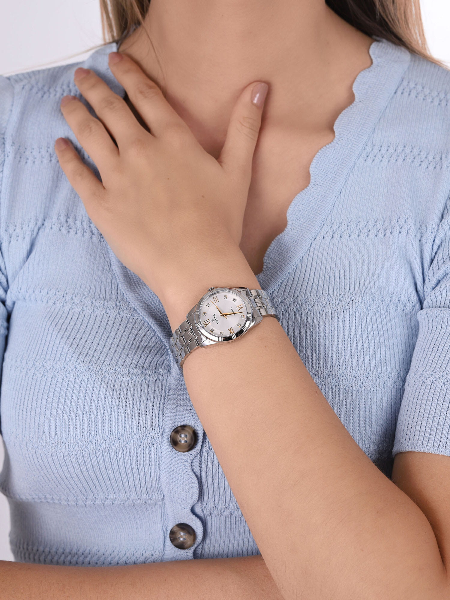 Яркий стиль и функциональность этих часов придутся по душе активной девушке. Кварцевый механизм с высокой точностью. Минеральное стеклоМинеральное стеклоМинеральное стекло представляет собой искусственно выращенный минерал кварца. Такое стекло отличается особой устойчивостью к повреждениям и царапинам. Уступает по некоторым качествам сапфировому стеклу. устойчивое к появлению царапин, обладающее высокой прозрачностью. Класс водозащиты: 50 метров, позволит защитить корпус от случайных брызг или капель дождя. Циферблат украшен цирконами. Корпус часов изготовлен из нержавеющей стали 316L. Браслет с раскладной застёжкойРаскладная застёжкаТакой тип застёжки используется только на браслетах из металла. Она никогда не раскрывается полностью, происходит разделение на 2 и более частей. Раскладывающая застёжка снизит вероятность потери часов к минимуму..