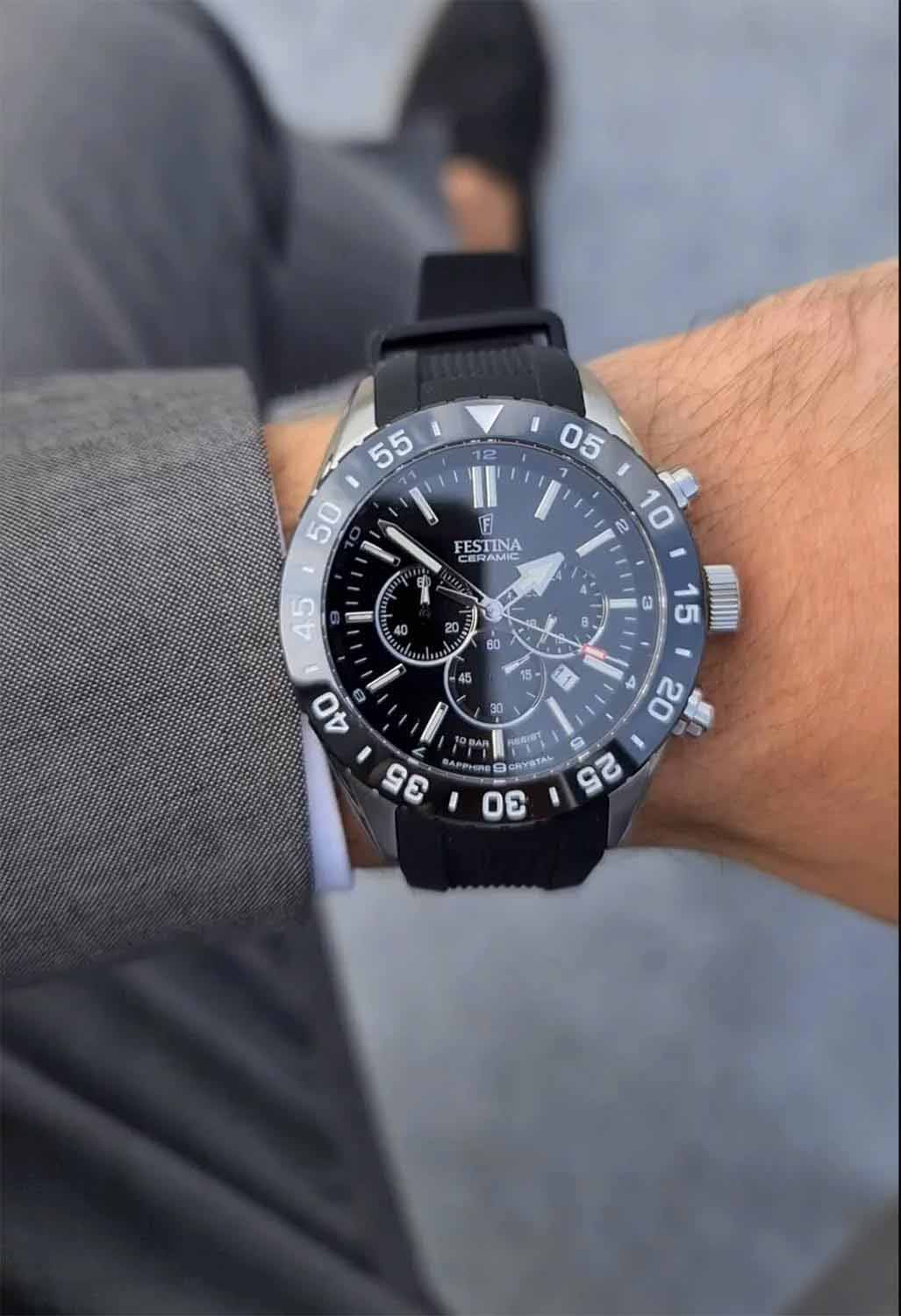 Festina F20515/2 — это современные наручные часы-хронографХронографФункция позволяет измерять отрезки времени с особой точностью: часы, минуты, секунды. Верным признаком хронографа является наличие на циферблате 3 дополнительных окошек-счётчиков. с секундомеромСекундомерСекундоме́р — прибор, способный измерять интервалы времени с точностью до долей секунды., которые сочетают стильный внешний вид и функциональность. Кварцевый механизм обеспечивает высокую точность измерения времени и простоту обслуживания. Сапфировое стеклоСапфировое стеклоПрочный и надёжный материал из кристалла сапфира синтетического происхождения, характеризующийся особой твёрдостью и устойчивостью к царапинам и повреждениям. отличается исключительной прозрачностью и высокой устойчивостью к царапинам, что сохраняет презентабельный внешний вид часов даже при активном использовании. Керамический безельБезельВнешний ободок, закрепляющий стекло. В спортивных часах так называется поворотное кольцо с делениями на циферблате, выполняет роль таймера – замеряет отрезки времени на шкале. Неподвижный безель – элемент декора. Однонаправленно вращающийся безель на дайверских часах позволяет фиксировать моменты погружения и выныривания на поверхность. придаёт модели дополнительную прочность и изысканность. Водозащита 100 метров позволяет не только плавать, но и заниматься дайвингом или другими водными видами спорта без риска для устройства. Стрелки и часовые метки с люминесцентным покрытиемЛюминесцентное покрытиеПозволяет считывать показания времени в темноте. Производители наносят на стрелки, часовые индексы, безель или поверхность циферблата светонакопительный состав, дающий холодное свечение. обеспечивают отличную видимость в темноте, также часы дополнены удобным календарем с окошком даты на позиции 4,5 часа. Корпус изготовлен из нержавеющей стали 316L, а удобный каучуковый ремешок с классической застежкой гарантирует комфортную посадку на запястье.