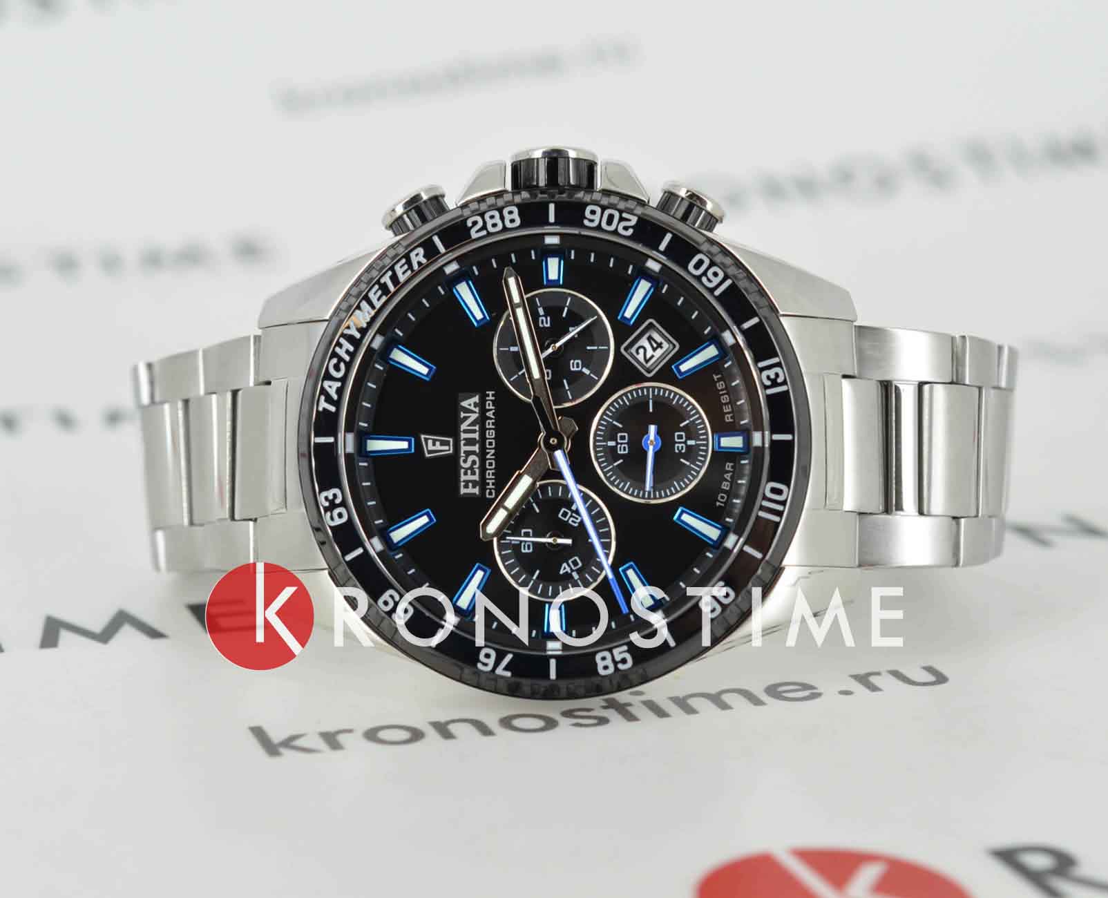 Festina F20560/5 — это эксклюзивный хронографХронографФункция позволяет измерять отрезки времени с особой точностью: часы, минуты, секунды. Верным признаком хронографа является наличие на циферблате 3 дополнительных окошек-счётчиков. с секундомеромСекундомерСекундоме́р — прибор, способный измерять интервалы времени с точностью до долей секунды. и тахиметромТахиметрРазмеченная шкала, располагается на ободке или безеле часов. Тахиметр позволяет рассчитать скорость на определённом участке пути, расстояние измеряется в километрах или милях., который станет отличным выбором для мужчин, ценящих стиль, функциональность и надежность. Часы отличаются продуманным дизайном и качественной отделкой, что делает их идеальными как для повседневной носки, так и для деловых встреч. Минеральное стеклоМинеральное стеклоМинеральное стекло представляет собой искусственно выращенный минерал кварца. Такое стекло отличается особой устойчивостью к повреждениям и царапинам. Уступает по некоторым качествам сапфировому стеклу. защищает циферблат от царапин и обладает высокой прозрачностью. Стрелки покрыты люминесцентным покрытиемЛюминесцентное покрытиеПозволяет считывать показания времени в темноте. Производители наносят на стрелки, часовые индексы, безель или поверхность циферблата светонакопительный состав, дающий холодное свечение., благодаря чему время легко считывается даже в темноте. БезельБезельВнешний ободок, закрепляющий стекло. В спортивных часах так называется поворотное кольцо с делениями на циферблате, выполняет роль таймера – замеряет отрезки времени на шкале. Неподвижный безель – элемент декора. Однонаправленно вращающийся безель на дайверских часах позволяет фиксировать моменты погружения и выныривания на поверхность. с PVDPVDУльтратонкое покрытие наносится в технике вакуумного напыления, сочетает в себе нитрид титана особой прочности со слоем золота или оксида хрома. Несёт в себе декоративную или защитную функцию. покрытием подчеркивает премиальный внешний вид. Водозащита 100 метров защищает от брызг и дождя. Корпус и браслет выполнены из высококачественной стали 316L, а браслет оснащён раскладной застёжкойРаскладная застёжкаТакой тип застёжки используется только на браслетах из металла. Она никогда не раскрывается полностью, происходит разделение на 2 и более частей. Раскладывающая застёжка снизит вероятность потери часов к минимуму. с системой блокировки для максимального комфорта и безопасности.