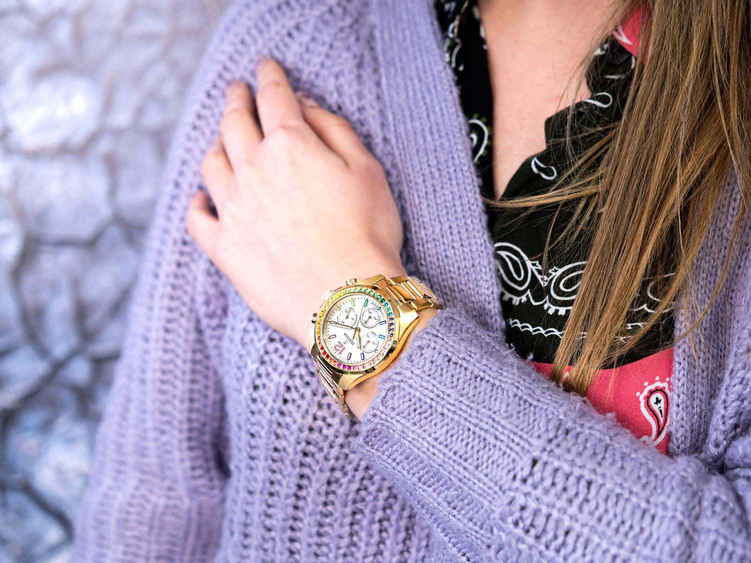 Яркий стиль и функциональность этих часов придутся по душе активной девушке. Часы-хронографХронографФункция позволяет измерять отрезки времени с особой точностью: часы, минуты, секунды. Верным признаком хронографа является наличие на циферблате 3 дополнительных окошек-счётчиков.. Кварцевый механизм с высокой точностью. Минеральное стеклоМинеральное стеклоМинеральное стекло представляет собой искусственно выращенный минерал кварца. Такое стекло отличается особой устойчивостью к повреждениям и царапинам. Уступает по некоторым качествам сапфировому стеклу. устойчивое к появлению царапин, обладающее высокой прозрачностью. Перламутровый циферблат. Стрелки и метки с люминесцентным покрытиемЛюминесцентное покрытиеПозволяет считывать показания времени в темноте. Производители наносят на стрелки, часовые индексы, безель или поверхность циферблата светонакопительный состав, дающий холодное свечение.. БезельБезельВнешний ободок, закрепляющий стекло. В спортивных часах так называется поворотное кольцо с делениями на циферблате, выполняет роль таймера – замеряет отрезки времени на шкале. Неподвижный безель – элемент декора. Однонаправленно вращающийся безель на дайверских часах позволяет фиксировать моменты погружения и выныривания на поверхность. с PVD-покрытиемPVDУльтратонкое покрытие наносится в технике вакуумного напыления, сочетает в себе нитрид титана особой прочности со слоем золота или оксида хрома. Несёт в себе декоративную или защитную функцию. украшенный кристаллами. Класс водозащиты: 100 метров, позволит плавать, нырять и заниматься другими водными видами спорта. Корпус часов изготовлен из нержавеющей стали с PVD-покрытиемPVDУльтратонкое покрытие наносится в технике вакуумного напыления, сочетает в себе нитрид титана особой прочности со слоем золота или оксида хрома. Несёт в себе декоративную или защитную функцию.. Браслет с PVD-покрытиемPVDУльтратонкое покрытие наносится в технике вакуумного напыления, сочетает в себе нитрид титана особой прочности со слоем золота или оксида хрома. Несёт в себе декоративную или защитную функцию. и с раскладной застёжкойРаскладная застёжкаТакой тип застёжки используется только на браслетах из металла. Она никогда не раскрывается полностью, происходит разделение на 2 и более частей. Раскладывающая застёжка снизит вероятность потери часов к минимуму..