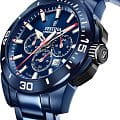 Часы-хронографХронографФункция позволяет измерять отрезки времени с особой точностью: часы, минуты, секунды. Верным признаком хронографа является наличие на циферблате 3 дополнительных окошек-счётчиков.. Кварцевый механизм с высокой точностью. Минеральное стеклоМинеральное стеклоМинеральное стекло представляет собой искусственно выращенный минерал кварца. Такое стекло отличается особой устойчивостью к повреждениям и царапинам. Уступает по некоторым качествам сапфировому стеклу. устойчивое к появлению царапин, обладающее высокой прозрачностью. Класс водозащиты: 100 метров, позволит плавать, нырять и заниматься другими водными видами спорта. Стрелки и метки с люминесцентным покрытиемЛюминесцентное покрытиеПозволяет считывать показания времени в темноте. Производители наносят на стрелки, часовые индексы, безель или поверхность циферблата светонакопительный состав, дающий холодное свечение.. Корпус часов изготовлен из нержавеющей стали c PVD-покрытиемPVDУльтратонкое покрытие наносится в технике вакуумного напыления, сочетает в себе нитрид титана особой прочности со слоем золота или оксида хрома. Несёт в себе декоративную или защитную функцию.. Браслет с раскладной застёжкойРаскладная застёжкаТакой тип застёжки используется только на браслетах из металла. Она никогда не раскрывается полностью, происходит разделение на 2 и более частей. Раскладывающая застёжка снизит вероятность потери часов к минимуму.. Каучуковый ремешок в комплекте.