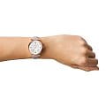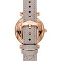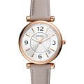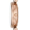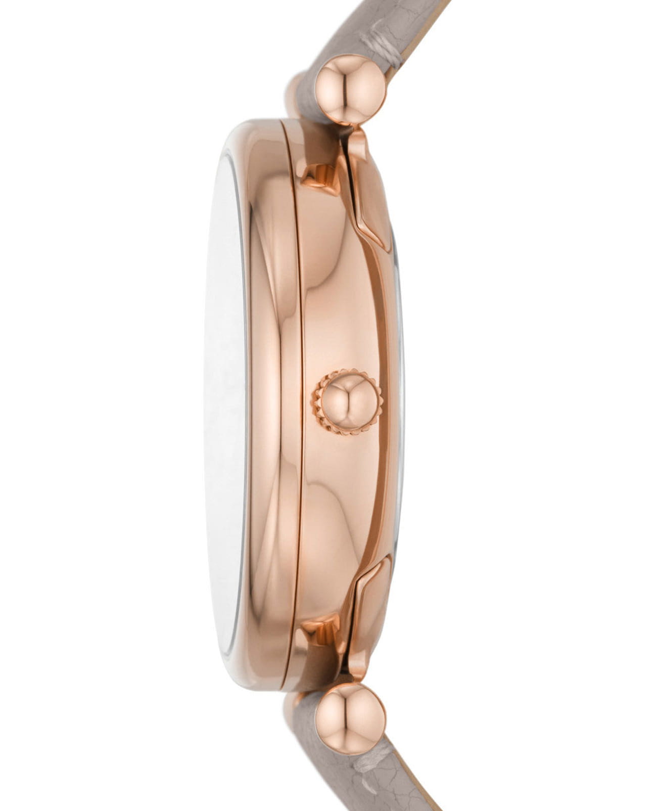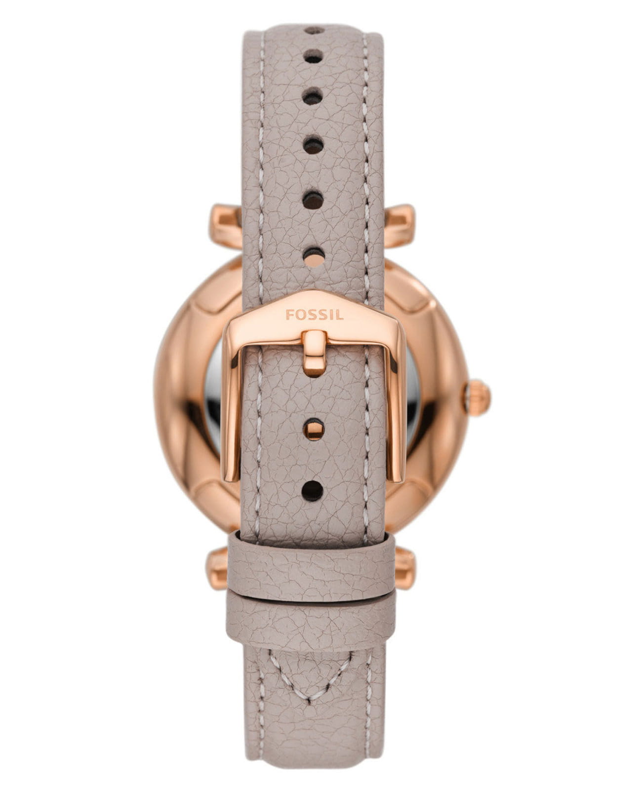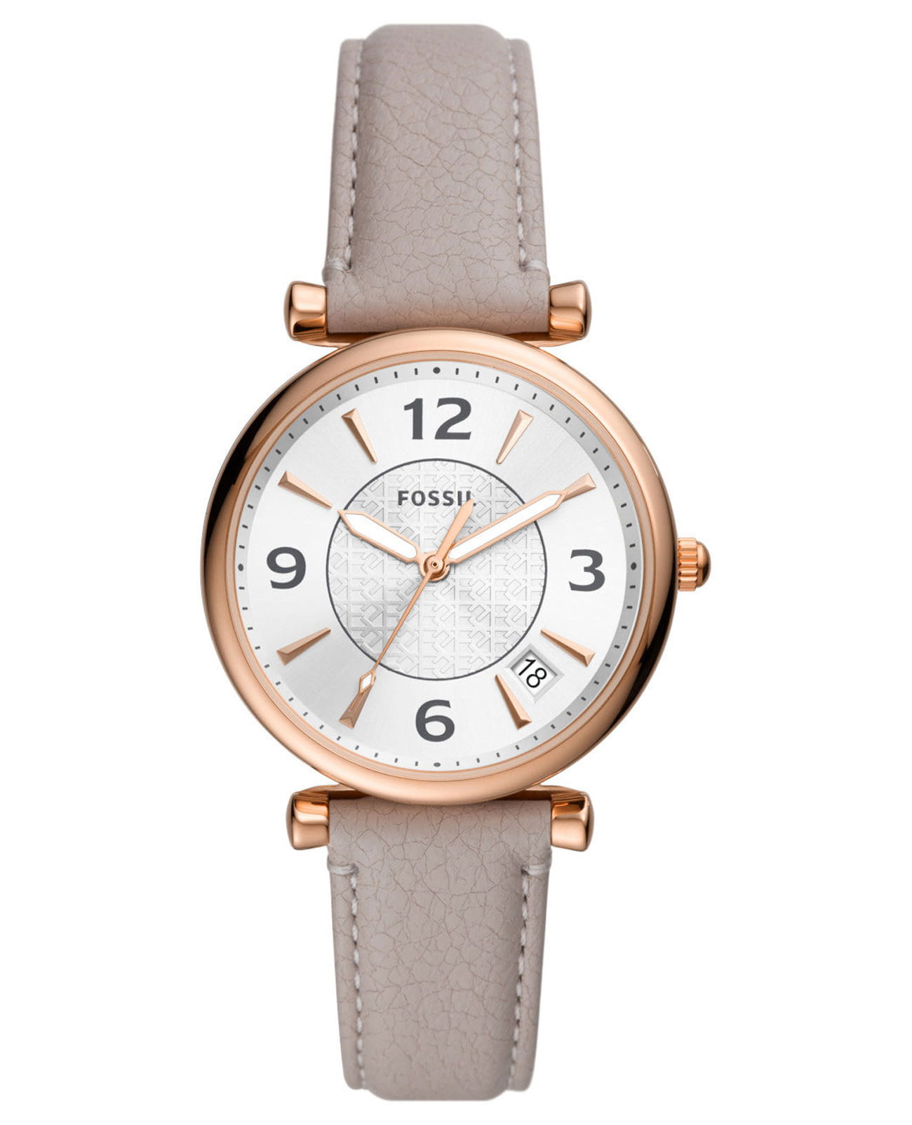 Женские американские часы с минеральным стекломМинеральное стеклоМинеральное стекло представляет собой искусственно выращенный минерал кварца. Такое стекло отличается особой устойчивостью к повреждениям и царапинам. Уступает по некоторым качествам сапфировому стеклу. Fossil Carlie ES5161, кварцевый механизм с высокой точностью. Корпус часов изготовлен из нержавеющей стали с IP-покрытиемIP-покрытиеМетод ионного напыления. Демонстрирует повышенную устойчивость к истиранию, окислению и химическим веществам. Под воздействием высокого давления и температуры около 1500°C молекулы металла надёжно соединяются с частицами корпуса часов.. Метки в виде арабских цифр и штрихов. Окошко даты на 4,5 часа. Стрелки с люминесцентным покрытиемЛюминесцентное покрытиеПозволяет считывать показания времени в темноте. Производители наносят на стрелки, часовые индексы, безель или поверхность циферблата светонакопительный состав, дающий холодное свечение.. Рифленая заводная головка с защитой. Класс водозащиты: 50 метров, позволит защитить корпус от случайных брызг или капель дождя. Кожаный ремешок на стандартной застежке.
