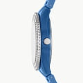 Женские американские часы с паве из кристаллов Fossil Stella ES5193, кварцевый механизм с высокой точностью. Класс водозащиты: 50 метров, позволит защитить корпус от случайных брызг или капель дождя. Круглый корпус часов изготовлен из пластика синего цвета. БезельБезельВнешний ободок, закрепляющий стекло. В спортивных часах так называется поворотное кольцо с делениями на циферблате, выполняет роль таймера – замеряет отрезки времени на шкале. Неподвижный безель – элемент декора. Однонаправленно вращающийся безель на дайверских часах позволяет фиксировать моменты погружения и выныривания на поверхность. украшен паве из кристаллов. Метки в виде штрихов, 12-ти часовая метка в виде римской цифры. 24 индикация, дата и день недели вынесены на малые циферблаты. Рифленая заводная головка. Браслет пластиковый синего цвета.