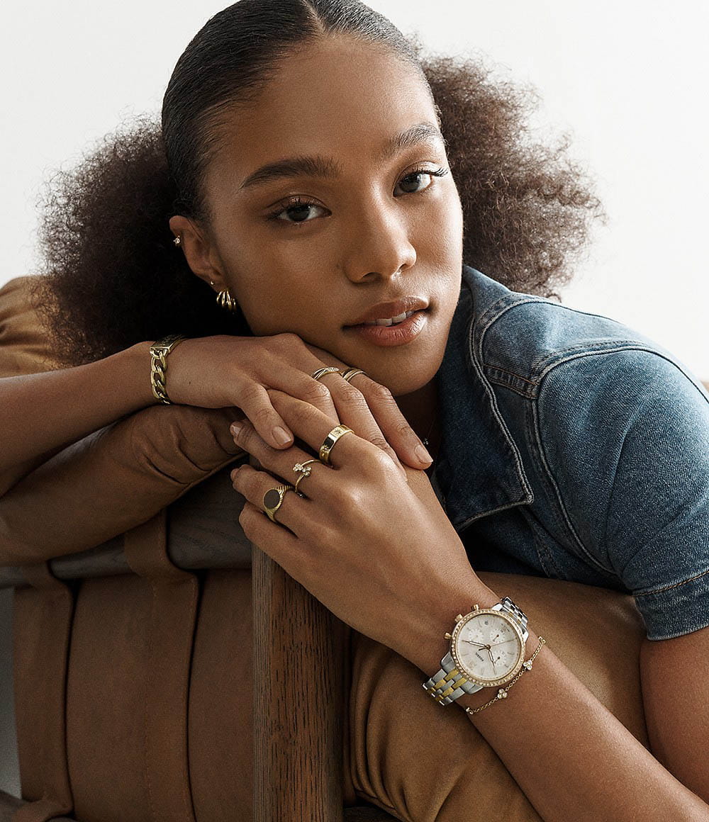Женские американские часы-хронографХронографФункция позволяет измерять отрезки времени с особой точностью: часы, минуты, секунды. Верным признаком хронографа является наличие на циферблате 3 дополнительных окошек-счётчиков. с секундомеромСекундомерСекундоме́р — прибор, способный измерять интервалы времени с точностью до долей секунды. Fossil Neutra ES5216, кварцевый механизм с высокой точностью. Класс водозащиты: 50 метров, позволит защитить корпус от случайных брызг или капель дождя. Корпус и браслет часов изготовлен из стали с частичным IP-покрытиемIP-покрытиеМетод ионного напыления. Демонстрирует повышенную устойчивость к истиранию, окислению и химическим веществам. Под воздействием высокого давления и температуры около 1500°C молекулы металла надёжно соединяются с частицами корпуса часов.. Система отображения времени 12-ти и 24-х часового формата. БезельБезельВнешний ободок, закрепляющий стекло. В спортивных часах так называется поворотное кольцо с делениями на циферблате, выполняет роль таймера – замеряет отрезки времени на шкале. Неподвижный безель – элемент декора. Однонаправленно вращающийся безель на дайверских часах позволяет фиксировать моменты погружения и выныривания на поверхность. украшен кристаллами. Циферблат перламутровый серебристый с окошком даты между 4 и 5 часами.