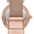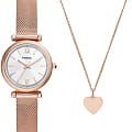 Женские американские часы  с минеральным стекломМинеральное стеклоМинеральное стекло представляет собой искусственно выращенный минерал кварца. Такое стекло отличается особой устойчивостью к повреждениям и царапинам. Уступает по некоторым качествам сапфировому стеклу. Fossil Carlie ES5314SET, кварцевый механизм с высокой точностью. Корпус и браслет часов изготовлены из нержавеющей стали с IP-покрытиемIP-покрытиеМетод ионного напыления. Демонстрирует повышенную устойчивость к истиранию, окислению и химическим веществам. Под воздействием высокого давления и температуры около 1500°C молекулы металла надёжно соединяются с частицами корпуса часов.. Циферблат выполнен по технологии Sunray (солнечные лучи). Метки в виде арабских цифр и штрихов.  Стрелки с люминесцентным покрытиемЛюминесцентное покрытиеПозволяет считывать показания времени в темноте. Производители наносят на стрелки, часовые индексы, безель или поверхность циферблата светонакопительный состав, дающий холодное свечение.. Рифленая заводная головка с защитой. Класс водозащиты: 50 метров, позволит защитить корпус от случайных брызг или капель дождя. Стальной браслет миланского плетения на раскладном замкеРаскладной замокДанный вариант застежки используется только на часах с металлическим браслетом. Отличительная особенность такого крепления в том, что длина браслета становится универсальной и вы можете самостоятельно отрегулировать нужный вам размер – застежка просто двигается по браслету часов.. В комплекте к часам прилагается кулон в виде сердца на цепочке.