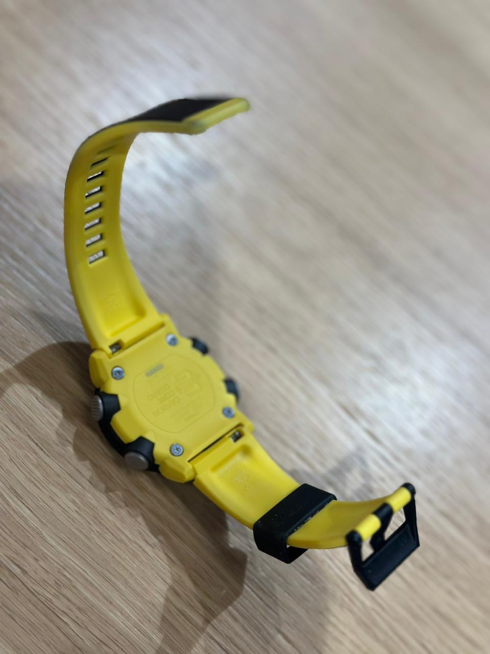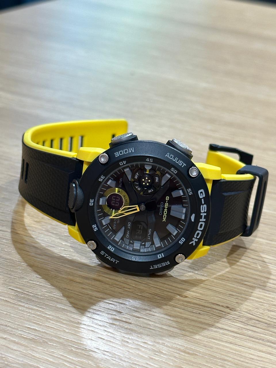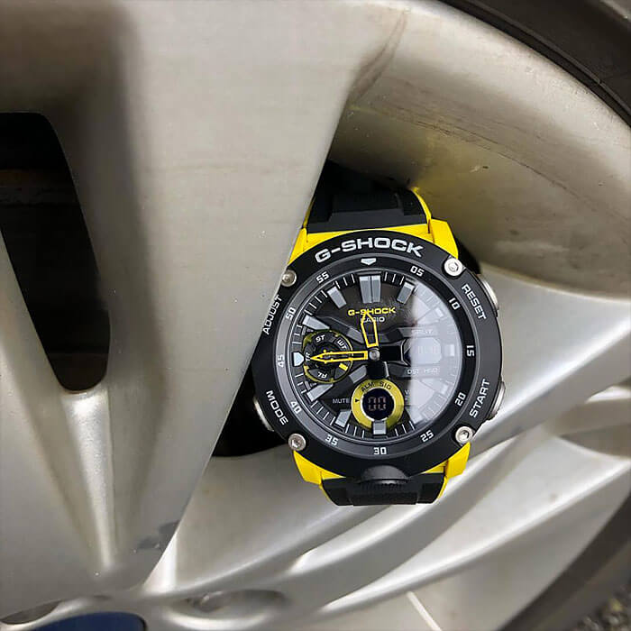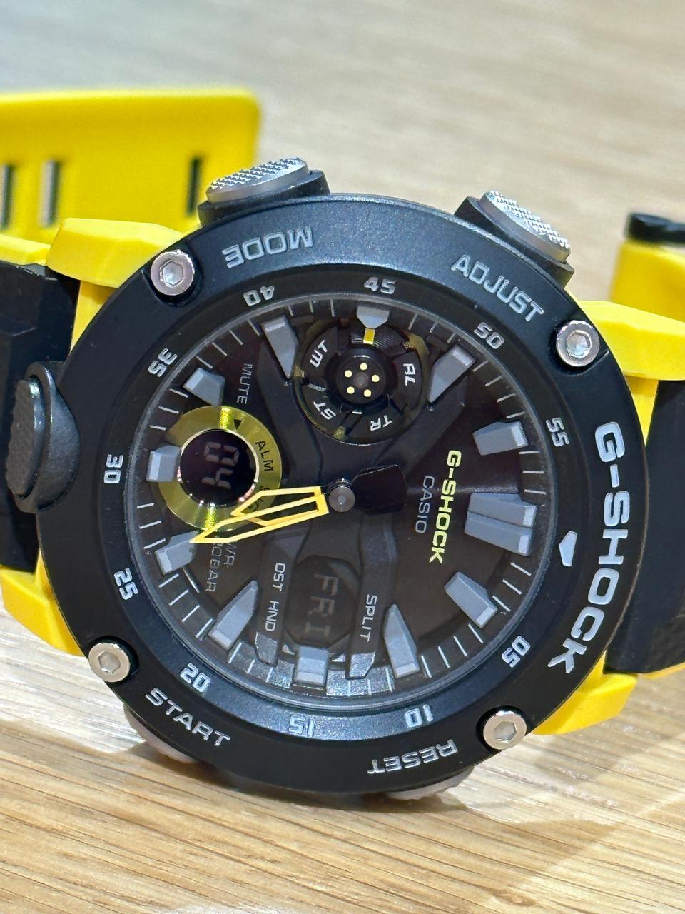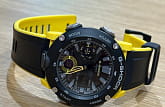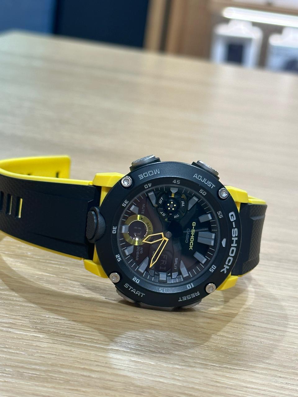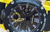 Наручные часы в чёрно-желтом исполнении реализуют технологию Carbon Core GuardCarbon Core Guard Новейшая структура корпуса, разработанная Casio. Полиуретановая пластина дополнительно усилена карбоновыми вставками, что придаёт специальную защиту от механических повреждений. Карбон отличается лёгкостью и прочностью., карбон послужил материалом для изготовления противоударного корпусаУдаропрочный корпусМеханизм заключён в корпус, выполненный из современных материалов, устойчивых к ударам, механическим повреждениям и падению с высоты: инновационный пластик, карбон, нержавеющая сталь, титан.. Это позволило добиться повышенной устойчивости к ударам и падению без утяжеления общей конструкции. БезельБезельВнешний ободок, закрепляющий стекло. В спортивных часах так называется поворотное кольцо с делениями на циферблате, выполняет роль таймера – замеряет отрезки времени на шкале. Неподвижный безель – элемент декора. Однонаправленно вращающийся безель на дайверских часах позволяет фиксировать моменты погружения и выныривания на поверхность. оставлен полимерным. Японский кварцевый механизм работает за счёт батарейки, срок службы которой - 3 года. Закаленное минеральное стекло. Двойная задняя крышка, стальная и пластиковая. Светодиодная подсветкаСветодиодная подсветкаСветодиодная или LED-подсветка обеспечивает появление яркого холодного свечения за счёт LED-элементов - маленьких лампочек. Они потребляют минимальное количество энергии, чаще всего можно встретить 1 светодиод, в нижней части циферблата.. Водонепроницаемость 200 метров. Возможность быстрой и лёгкой замены полимерного ремешка. ХронографХронографФункция позволяет измерять отрезки времени с особой точностью: часы, минуты, секунды. Верным признаком хронографа является наличие на циферблате 3 дополнительных окошек-счётчиков., автоматический календарь, мировое времяМировое время Полезное часовое усложнение, отображающее время в основных городах и известных областях по всему миру, оно связано с часовыми поясами, удобно для путешественников и бизнесменов. , будильник, секундомер, таймер с автоповтором. Габариты: 48,7 x 51,2 x 14,1 мм.