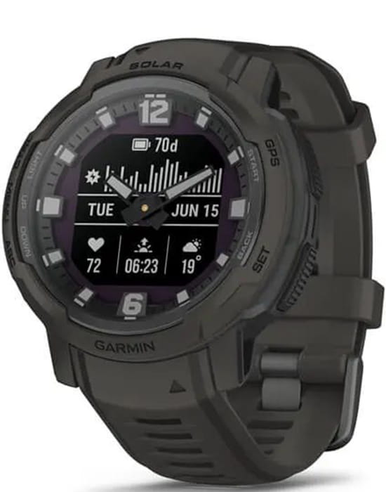 Умные многофункциональные мужские часы Garmin Instinct Crossover Solar 010-02730-01, электронный механизм с высокой точностью. Класс водозащиты: 100 метров, позволит плавать, нырять и заниматься другими водными видами спорта. Материал корпуса: Фиброармированный полимер Ударопрочный корпусУдаропрочный корпусМеханизм заключён в корпус, выполненный из современных материалов, устойчивых к ударам, механическим повреждениям и падению с высоты: инновационный пластик, карбон, нержавеющая сталь, титан.. Минеральное стеклоМинеральное стеклоМинеральное стекло представляет собой искусственно выращенный минерал кварца. Такое стекло отличается особой устойчивостью к повреждениям и царапинам. Уступает по некоторым качествам сапфировому стеклу. которое было химически усиленно. Экран с светодиодной подсветкойСветодиодная подсветкаСветодиодная или LED-подсветка обеспечивает появление яркого холодного свечения за счёт LED-элементов - маленьких лампочек. Они потребляют минимальное количество энергии, чаще всего можно встретить 1 светодиод, в нижней части циферблата..