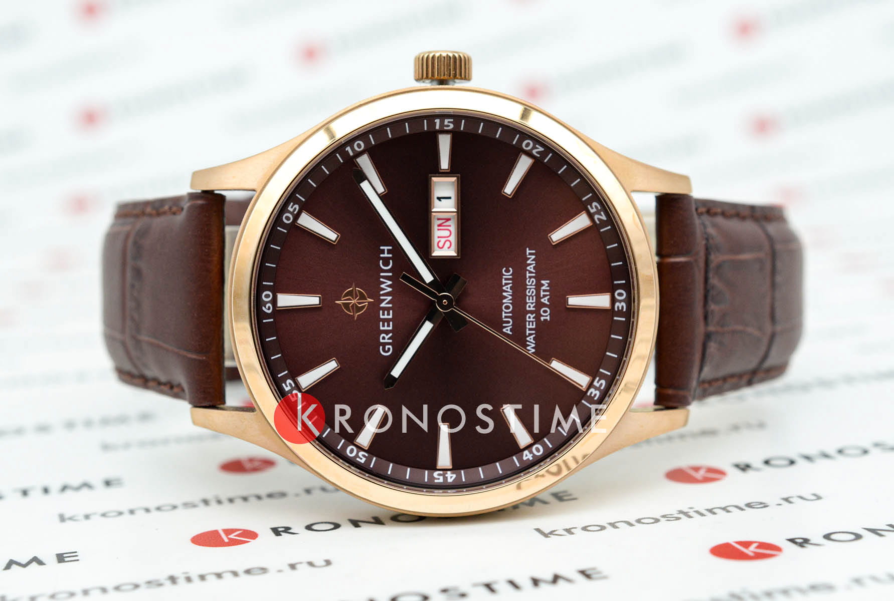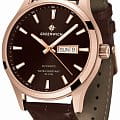 Часы Greenwich Good Luck GW 054.42.32 — это мужская модель, сочетающая элегантность и классический дизайн. Корпус диаметром 43 мм выполнен из нержавеющей стали с PVD-покрытиемPVDУльтратонкое покрытие наносится в технике вакуумного напыления, сочетает в себе нитрид титана особой прочности со слоем золота или оксида хрома. Несёт в себе декоративную или защитную функцию. из розового золота, сочетающим зеркальную полировку на безеле и матовую отделку на остальных частях корпуса. Коричневый циферблат с полировкой оснащён накладными часовыми метками и крупными стрелками с люминесцентным покрытием, обеспечивающим хорошую читаемость в условиях низкой освещённости. Циферблат защищён минеральным стекломМинеральное стеклоМинеральное стекло представляет собой искусственно выращенный минерал кварца. Такое стекло отличается особой устойчивостью к повреждениям и царапинам. Уступает по некоторым качествам сапфировому стеклу.. Модель оснащена автоматическим механизмом TMI с функциями отображения даты и дня недели. Запас хода составляет около 40 часов. Прозрачная задняя крышка позволяет наблюдать за работой механизма, на роторе которого выгравирован силуэт парусника — символ английских мореходов и название серии. Водозащита до 10 атмосфер (100 метров) делает часы подходящими для плавания и других водных активностей. Ремешок из натуральной коричневой кожи с прошивкой обеспечивает комфортное ношение и надёжную фиксацию на запястье. Эта модель идеально подойдёт для тех, кто ценит сочетание классического стиля и современных технологий.