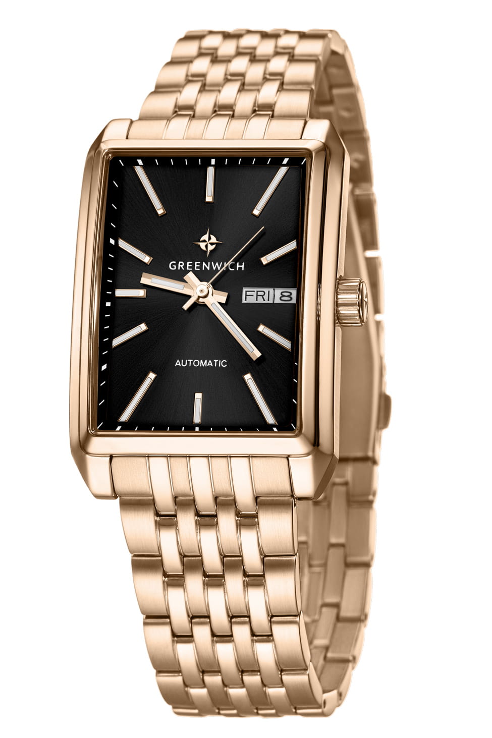 Английские механические наручные мужские часы с автоподзаводом и с минеральным стекломМинеральное стеклоМинеральное стекло представляет собой искусственно выращенный минерал кварца. Такое стекло отличается особой устойчивостью к повреждениям и царапинам. Уступает по некоторым качествам сапфировому стеклу. Greenwich Caravel GW 564.20.11, представляют собой классический вариант для повседневной носки. Корпус и браслет часов выполнен из нержавеющей стали с PVD-покрытиемPVDУльтратонкое покрытие наносится в технике вакуумного напыления, сочетает в себе нитрид титана особой прочности со слоем золота или оксида хрома. Несёт в себе декоративную или защитную функцию.. Окошко даты и дня недели находится в положении 3 часа. Стрелки с люминесцентным покрытиемЛюминесцентное покрытиеПозволяет считывать показания времени в темноте. Производители наносят на стрелки, часовые индексы, безель или поверхность циферблата светонакопительный состав, дающий холодное свечение.. 50 метров, позволит защитить корпус от случайных брызг или капель дождя.