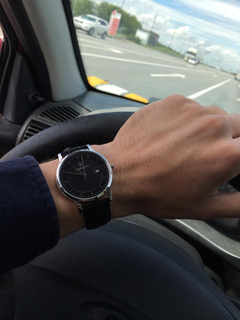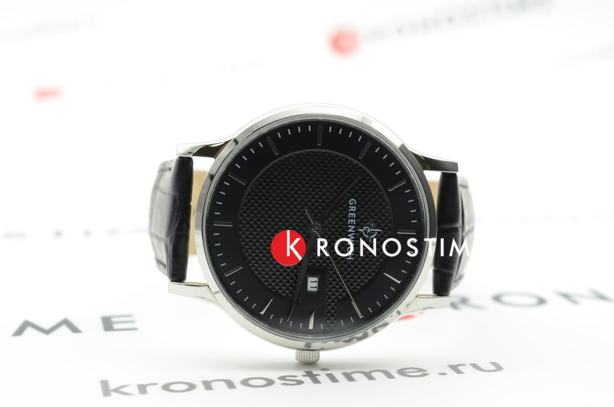 Часы классические , на кожаном черном ремешке. Циферблат выглядит объемным из-за того, что часть выполнена в технике гильоше. В модели представлена дополнительная функция – дата. Циферблат надежно защищен минеральным стеклом. Задняя крышка часов украшена изображениями «розы ветров» и корабля, который является символом марки Greenwich.