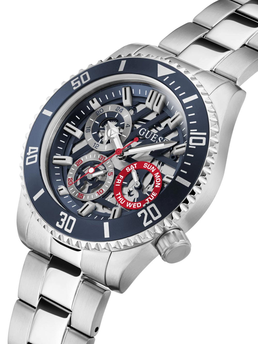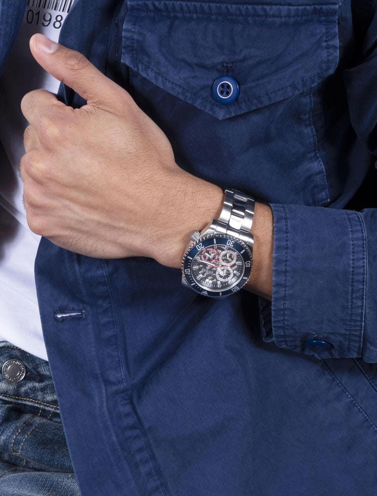 Кварцевый механизм с высокой точностью. Минеральное стеклоМинеральное стеклоМинеральное стекло представляет собой искусственно выращенный минерал кварца. Такое стекло отличается особой устойчивостью к повреждениям и царапинам. Уступает по некоторым качествам сапфировому стеклу. устойчивое к появлению царапин, обладающее высокой прозрачностью. Стрелки с люминесцентным покрытиемЛюминесцентное покрытиеПозволяет считывать показания времени в темноте. Производители наносят на стрелки, часовые индексы, безель или поверхность циферблата светонакопительный состав, дающий холодное свечение.. Класс водозащиты: 50 метров, позволит защитить корпус от случайных брызг или капель дождя. Корпус часов изготовлен из нержавеющей стали. Браслет с раскладной застёжкойРаскладная застёжкаТакой тип застёжки используется только на браслетах из металла. Она никогда не раскрывается полностью, происходит разделение на 2 и более частей. Раскладывающая застёжка снизит вероятность потери часов к минимуму..