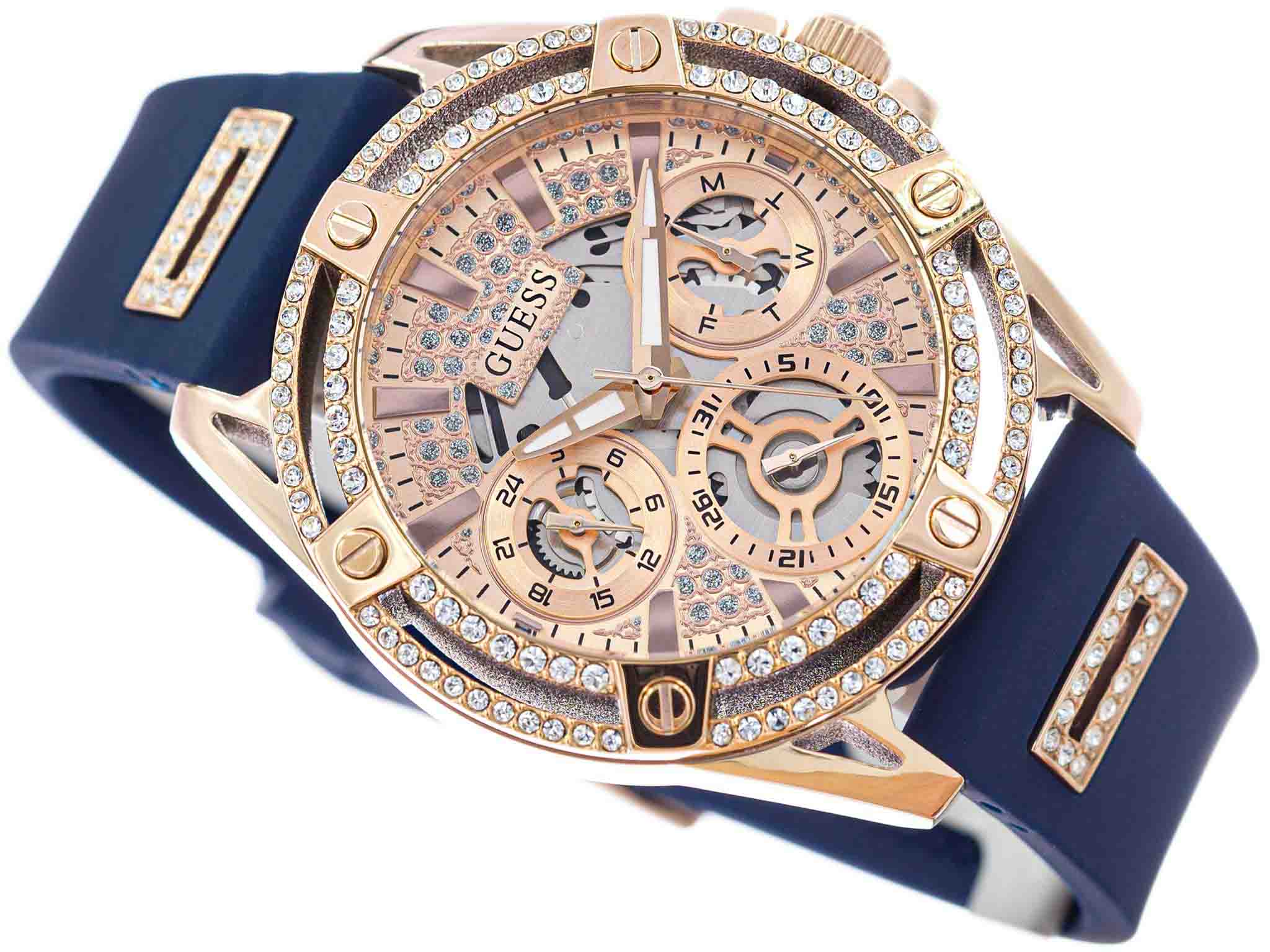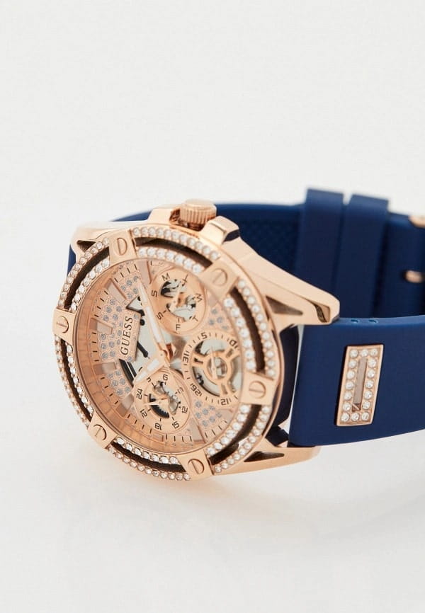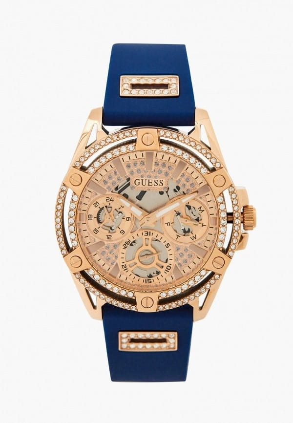 Женские наручные часы-скелетоны с минеральным стекломМинеральное стеклоМинеральное стекло представляет собой искусственно выращенный минерал кварца. Такое стекло отличается особой устойчивостью к повреждениям и царапинам. Уступает по некоторым качествам сапфировому стеклу. Guess Queen GW0536L5, кварцевый механизм с высокой точностью. Класс водозащиты: 30 метров, позволит защитить корпус от случайных брызг или капель дождя. Корпус часов изготовлен из стали с IP-покрытиемIP-покрытиеМетод ионного напыления. Демонстрирует повышенную устойчивость к истиранию, окислению и химическим веществам. Под воздействием высокого давления и температуры около 1500°C молекулы металла надёжно соединяются с частицами корпуса часов.. Силиконовый ремешок на стандартной застёжке. 24-х часовой формат времени, дата и день недели вынесены на отдельные циферблаты. Метки в виде штрихов. Рифленая заводная головка с защитой. Циферблат и ремешок украшены кристаллами.