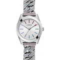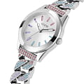 Женские наручные часы Guess Trend GW0546L4 с минеральным стекломМинеральное стеклоМинеральное стекло представляет собой искусственно выращенный минерал кварца. Такое стекло отличается особой устойчивостью к повреждениям и царапинам. Уступает по некоторым качествам сапфировому стеклу., кварцевый механизм с высокой точностью. Корпус часов и браслет изготовлены из стали. Стрелки с люминесцентным покрытиемЛюминесцентное покрытиеПозволяет считывать показания времени в темноте. Производители наносят на стрелки, часовые индексы, безель или поверхность циферблата светонакопительный состав, дающий холодное свечение.. Класс водозащиты: 30 метров, позволит защитить корпус от случайных брызг или капель дождя. Браслет из нержавеющей стали частично украшен кристаллами на ювелирной застежке.