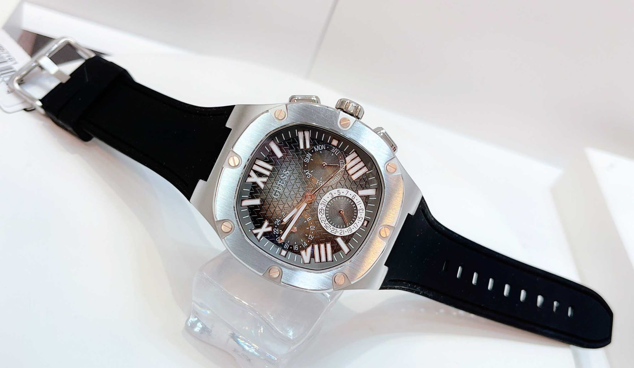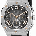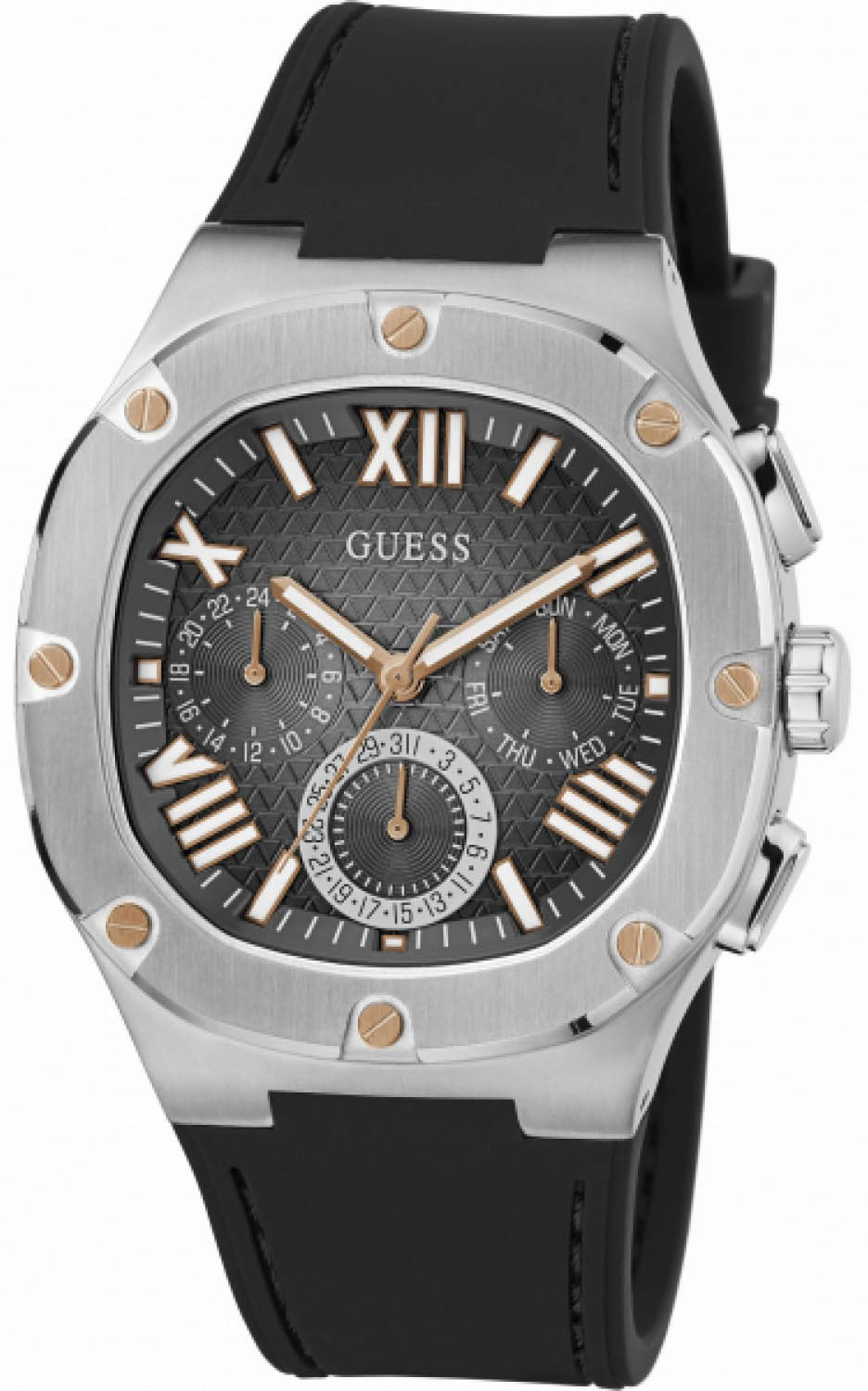 Мужские наручные часы Guess Headline GW0571G1 с минеральным стекломМинеральное стеклоМинеральное стекло представляет собой искусственно выращенный минерал кварца. Такое стекло отличается особой устойчивостью к повреждениям и царапинам. Уступает по некоторым качествам сапфировому стеклу., кварцевый механизм с высокой точностью. Класс водозащиты: 50 метров, позволит защитить корпус от случайных брызг или капель дождя. Стрелки с люминесцентным покрытиемЛюминесцентное покрытиеПозволяет считывать показания времени в темноте. Производители наносят на стрелки, часовые индексы, безель или поверхность циферблата светонакопительный состав, дающий холодное свечение.. Корпус часов и безельБезельВнешний ободок, закрепляющий стекло. В спортивных часах так называется поворотное кольцо с делениями на циферблате, выполняет роль таймера – замеряет отрезки времени на шкале. Неподвижный безель – элемент декора. Однонаправленно вращающийся безель на дайверских часах позволяет фиксировать моменты погружения и выныривания на поверхность. изготовлены из стали. Силиконовый ремешок с классической застежкой. Рифленая заводная головка. Гильошированный циферблат. 24-х часовой формат времени, число и день недели отображаются на отдельных циферблатах. Метки в виде римских цифр и штрихов.