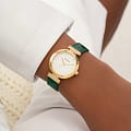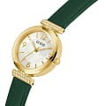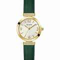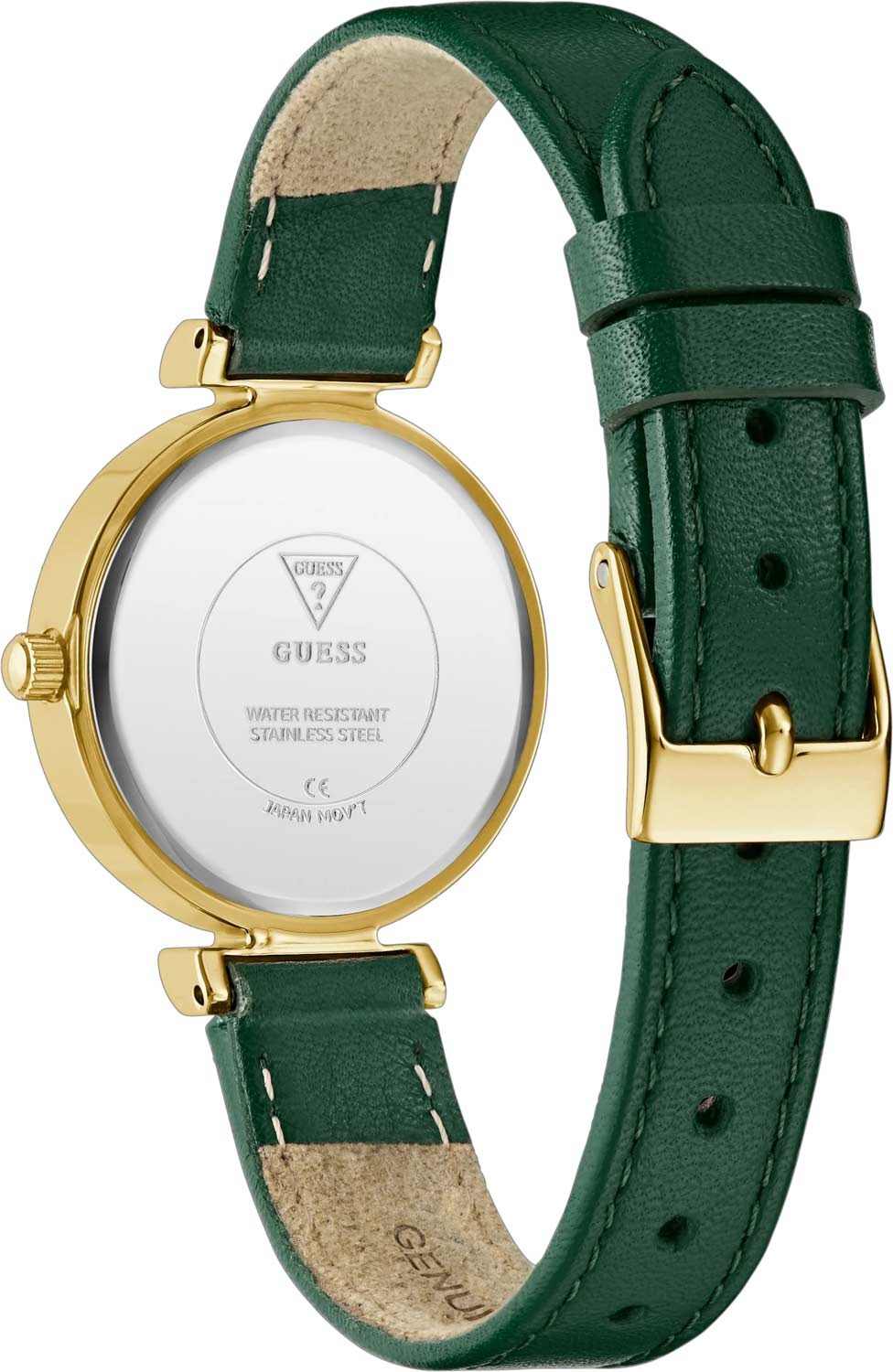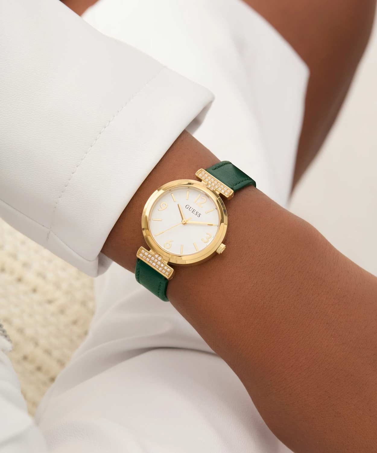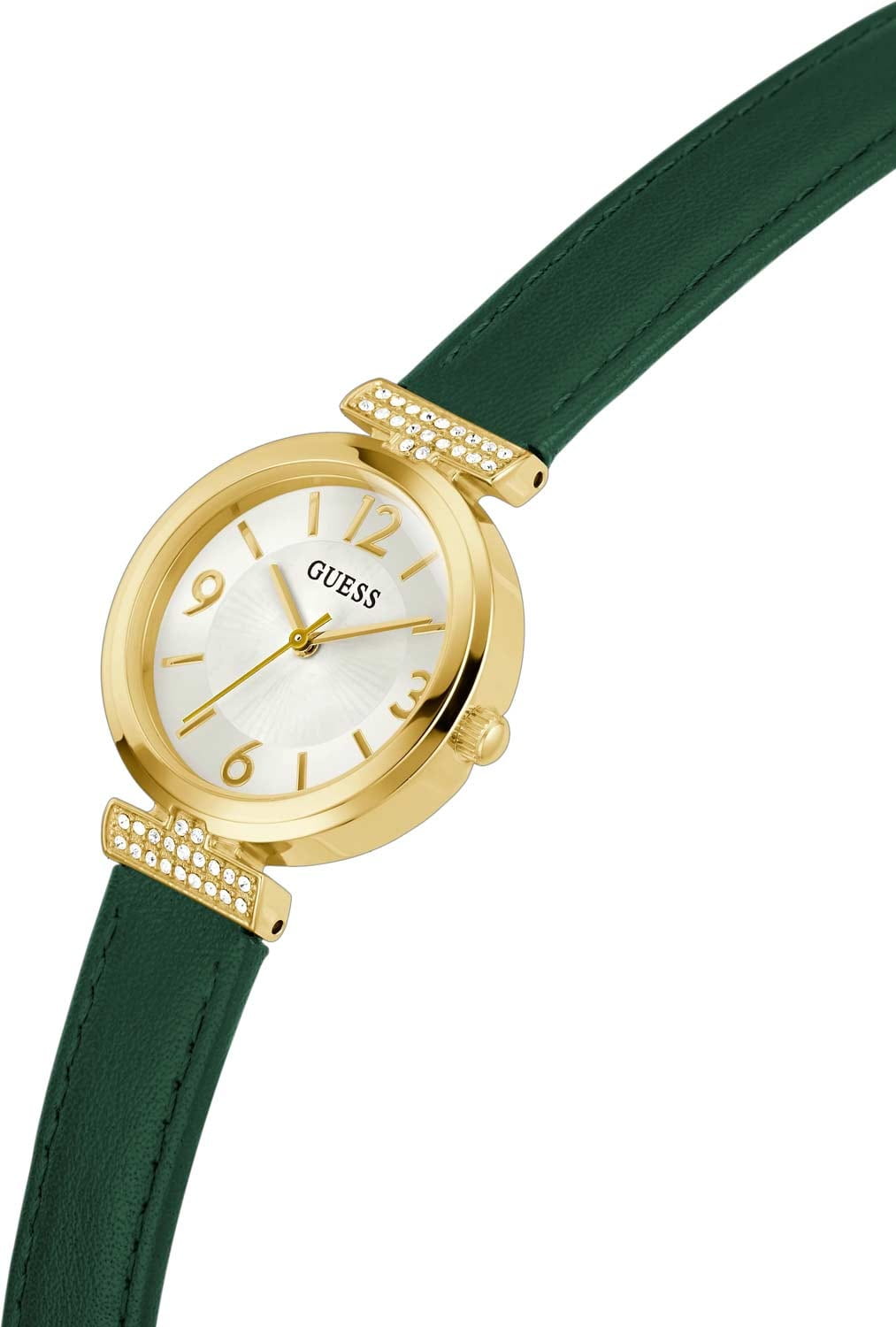 Часы Guess GW0614L4 представляют собой элегантное сочетание стиля и технологии. Оснащенные кварцевым механизмом, они обеспечивают точность и надежность. Корпус выполнен из стали с IP-покрытиемIP-покрытиеМетод ионного напыления. Демонстрирует повышенную устойчивость к истиранию, окислению и химическим веществам. Под воздействием высокого давления и температуры около 1500°C молекулы металла надёжно соединяются с частицами корпуса часов., что придаёт модели прочность и изысканный внешний вид. Белый циферблат украшен гильошированным узором в центральной части, а метки выполнены в виде штрихов и арабских цифр, что обеспечивает легкость восприятия времени. Круглый корпус декорирован кристаллами, добавляя блеск и шарм. Минеральное стеклоМинеральное стеклоМинеральное стекло представляет собой искусственно выращенный минерал кварца. Такое стекло отличается особой устойчивостью к повреждениям и царапинам. Уступает по некоторым качествам сапфировому стеклу. защищает циферблат, а рифленая заводная головка облегчает настройку времени. Кожаный ремешок зеленого цвета с классической застежкой обеспечивает комфортное ношение на протяжении всего дня. Водозащита 30WR защищает часы от брызг и дождя, делая их практичными для повседневного использования. Габариты часов включают диаметр 28 мм, толщину 7 мм, ширину ремешка 10 мм и длину ремешка 185 мм, что делает их отличным аксессуаром для стильного образа.
