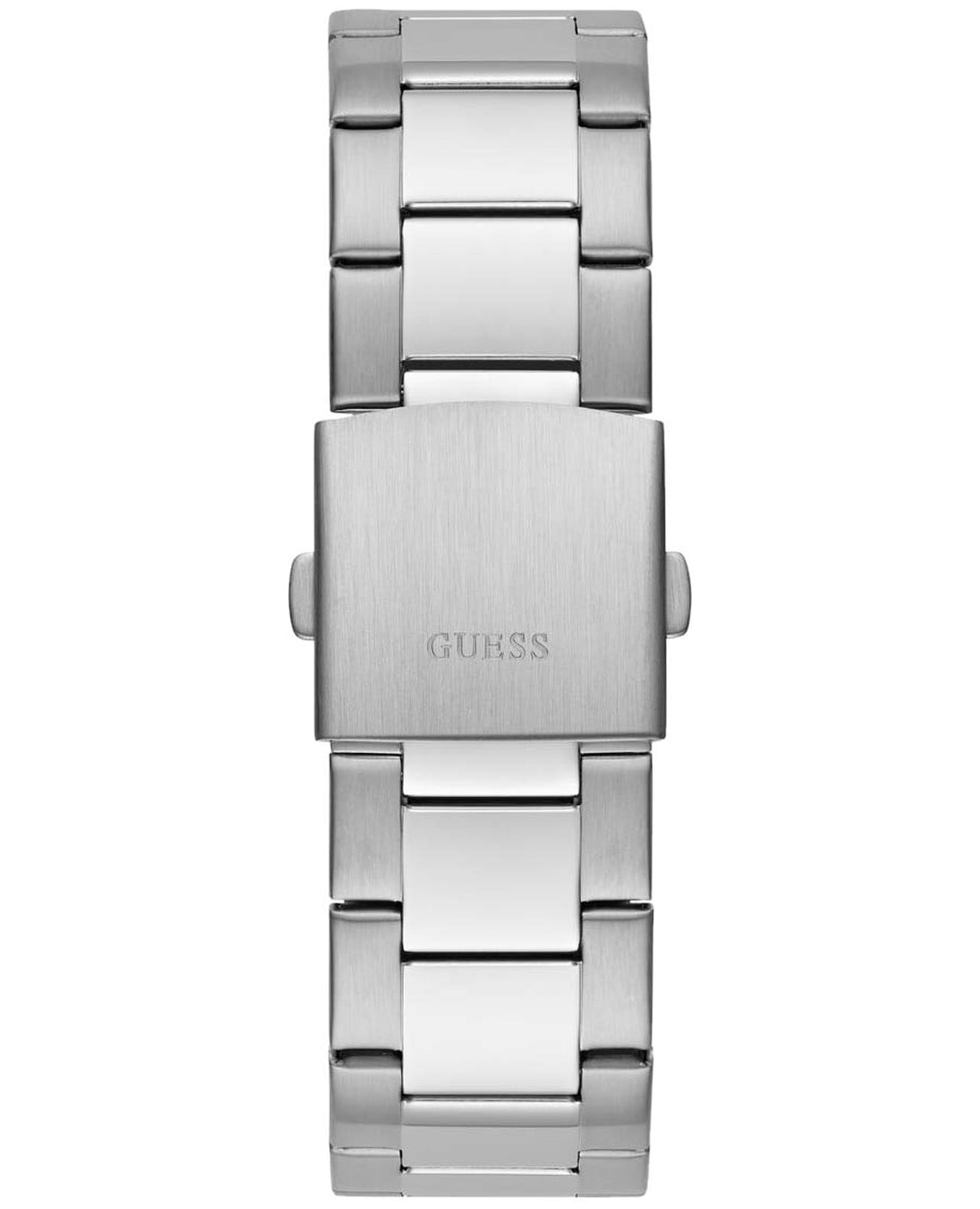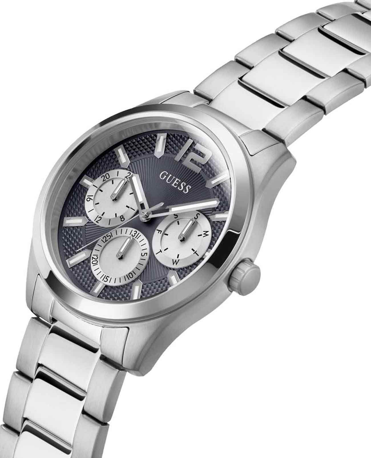 Мужские наручные часы с минеральным стекломМинеральное стеклоМинеральное стекло представляет собой искусственно выращенный минерал кварца. Такое стекло отличается особой устойчивостью к повреждениям и царапинам. Уступает по некоторым качествам сапфировому стеклу. Guess Dress GW0707G1, кварцевый механизм с высокой точностью. Корпус часов изготовлен из стали. 24-х часовой формат времени, число и день недели отображаются на отдельных циферблатах. Стрелки с люминесцентным покрытиемЛюминесцентное покрытиеПозволяет считывать показания времени в темноте. Производители наносят на стрелки, часовые индексы, безель или поверхность циферблата светонакопительный состав, дающий холодное свечение.. Класс водозащиты: 50 метров, позволит защитить корпус от случайных брызг или капель дождя. Стальной браслет на раскладной застёжкеРаскладная застёжкаТакой тип застёжки используется только на браслетах из металла. Она никогда не раскрывается полностью, происходит разделение на 2 и более частей. Раскладывающая застёжка снизит вероятность потери часов к минимуму..
