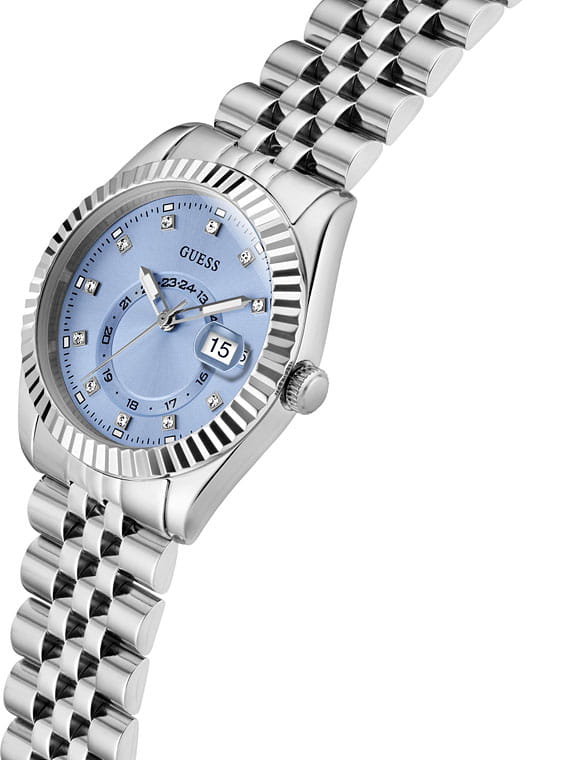 Элегантные женские наручные часы Guess GW0936L1 сочетают в себе стиль и функциональность. Эти часы оснащены точным кварцевым механизмом, что гарантирует надежность и долговечность. Корпус часов выполнен из прочной нержавеющей стали серебристого цвета, диаметром 34мм. Рифленый безельБезельВнешний ободок, закрепляющий стекло. В спортивных часах так называется поворотное кольцо с делениями на циферблате, выполняет роль таймера – замеряет отрезки времени на шкале. Неподвижный безель – элемент декора. Однонаправленно вращающийся безель на дайверских часах позволяет фиксировать моменты погружения и выныривания на поверхность. придающими часам роскошный вид. Циферблат добавляет изделию утонченности и особого шарма. Часы оснащены стальным браслетом на раскладной застёжкеРаскладная застёжкаТакой тип застёжки используется только на браслетах из металла. Она никогда не раскрывается полностью, происходит разделение на 2 и более частей. Раскладывающая застёжка снизит вероятность потери часов к минимуму., которая обеспечивает комфортное прилегание к запястью и надежную фиксацию. Минеральное стеклоМинеральное стеклоМинеральное стекло представляет собой искусственно выращенный минерал кварца. Такое стекло отличается особой устойчивостью к повреждениям и царапинам. Уступает по некоторым качествам сапфировому стеклу. защищает циферблат от царапин и повреждений, сохраняя его безупречный вид. Водозащита 30WR гарантирует защиту от случайных брызг и дождя, что делает эти часы практичным аксессуаром для повседневной жизни. Стрелки и метки с люминесцентным покрытиемЛюминесцентное покрытиеПозволяет считывать показания времени в темноте. Производители наносят на стрелки, часовые индексы, безель или поверхность циферблата светонакопительный состав, дающий холодное свечение. обеспечивает отличную видимость в темноте. Окошко даты находится в положении 3 часа. Guess – это не просто аксессуар, это заявление о вашем безупречном вкусе и стремлении к совершенству.