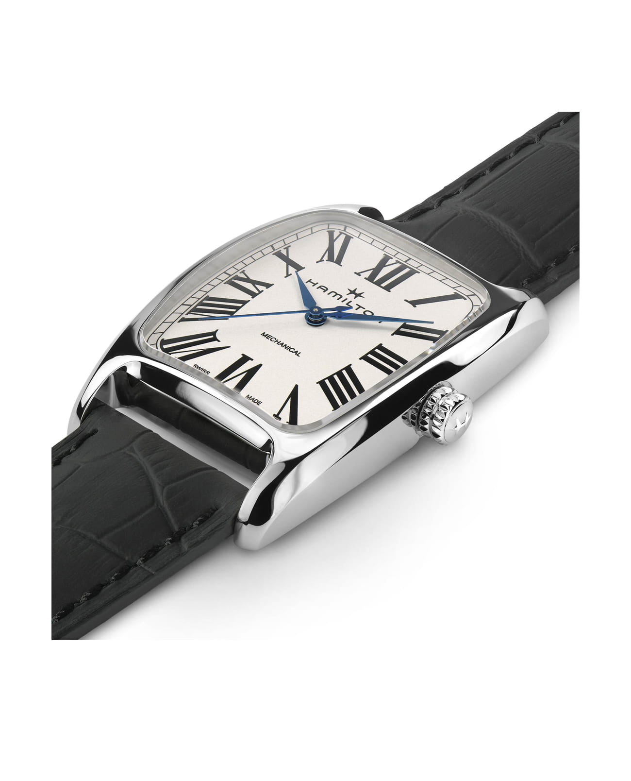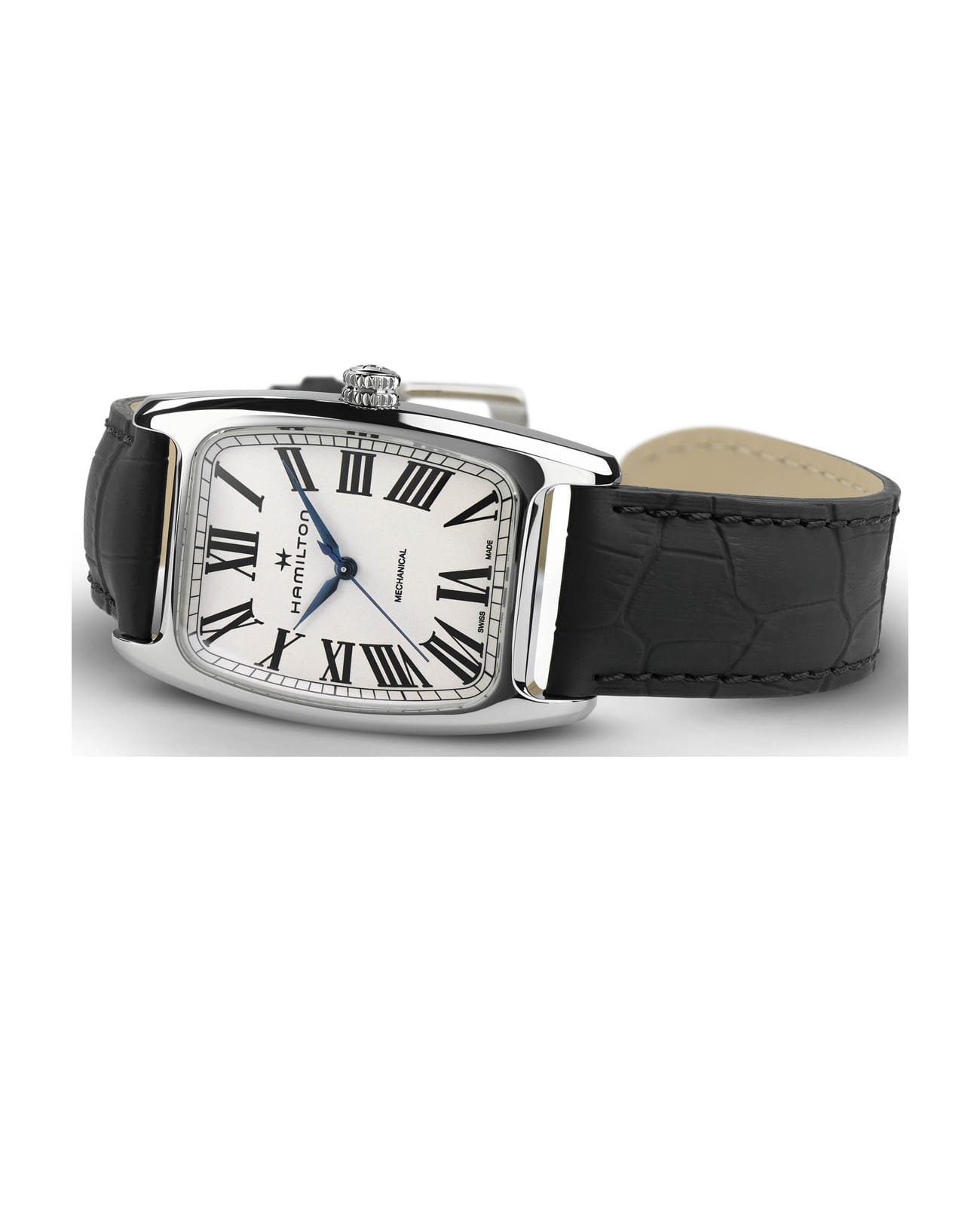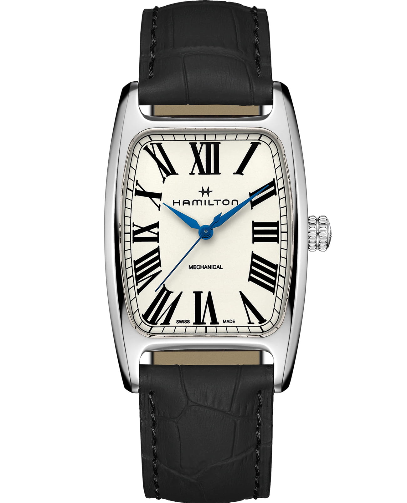 Мужские механические часы Hamilton H13519711 из коллекции American Classic — элегантная классика с швейцарской точностью. Прямоугольный корпус размером 38 мм из нержавеющей стали, белый циферблат с римскими цифрами. Стекло — сапфировоеСапфировое стеклоПрочный и надёжный материал из кристалла сапфира синтетического происхождения, характеризующийся особой твёрдостью и устойчивостью к царапинам и повреждениям. с антибликовым покрытием. Механизм — швейцарский калибр H-50 с запасом хода до 80 часов. Водонепроницаемость 50 м. Ремешок — из кожи на классической застёжкеРаскладной замокДанный вариант застежки используется только на часах с металлическим браслетом. Отличительная особенность такого крепления в том, что длина браслета становится универсальной и вы можете самостоятельно отрегулировать нужный вам размер – застежка просто двигается по браслету часов.. Идеальный выбор для тех, кто ценит швейцарское качество и винтажный американский стиль.