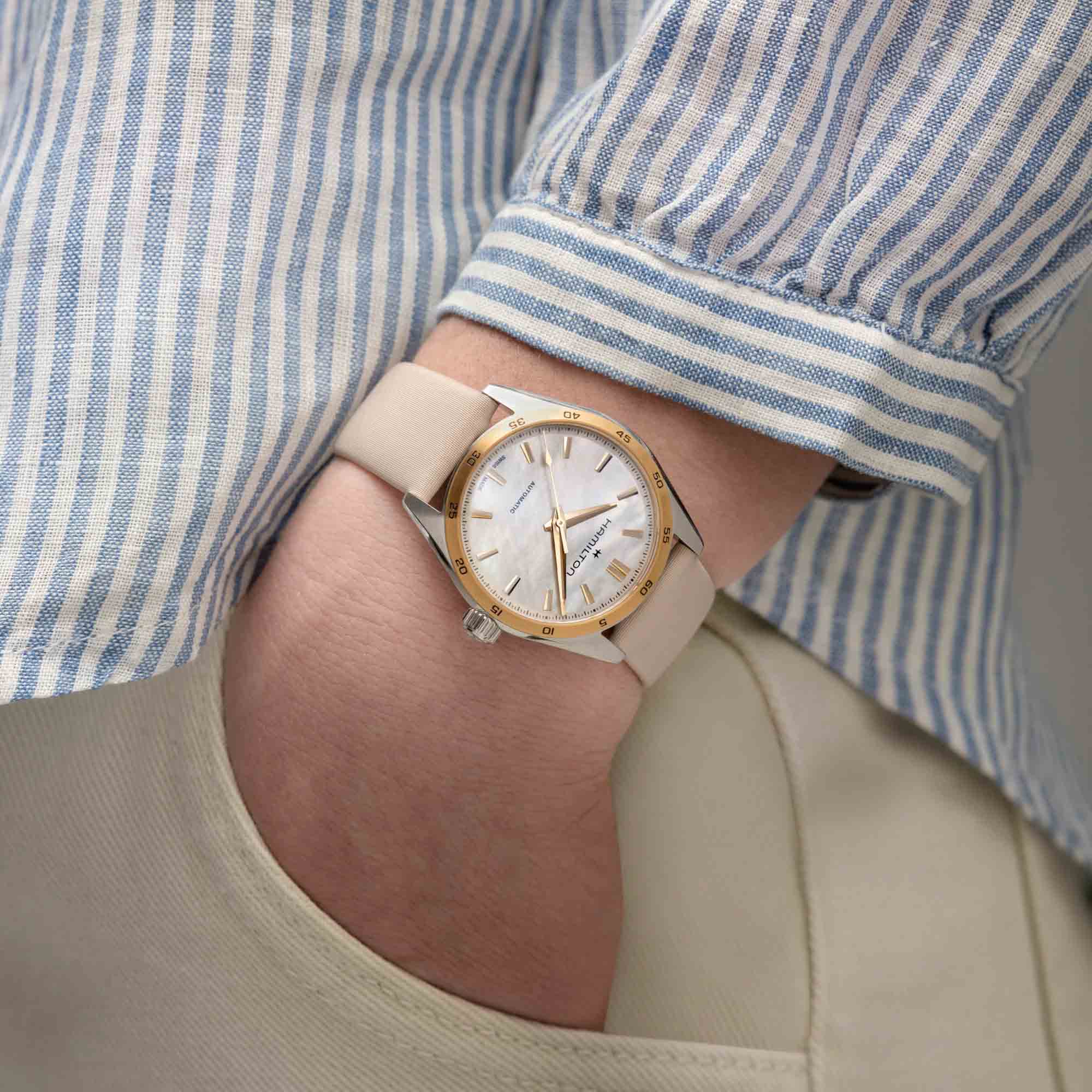 Модели из линии Jazzmaster Performer, привлекающие внимание ярким дизайном в стиле спортивный шик, сочетают в себе функциональность и эстетичность. Часы Jazzmaster Performer Automatic оснащены автоматическим механизмом H-10 с 80-часовым запасом хода. Модель в корпусе из нержавеющей стали диаметром 34 мм имеет безельБезельВнешний ободок, закрепляющий стекло. В спортивных часах так называется поворотное кольцо с делениями на циферблате, выполняет роль таймера – замеряет отрезки времени на шкале. Неподвижный безель – элемент декора. Однонаправленно вращающийся безель на дайверских часах позволяет фиксировать моменты погружения и выныривания на поверхность. с PVD-покрытиемPVDУльтратонкое покрытие наносится в технике вакуумного напыления, сочетает в себе нитрид титана особой прочности со слоем золота или оксида хрома. Несёт в себе декоративную или защитную функцию. цвета розового золота, переливающийся перламутровый циферблат и бежевый атласный ремешок.