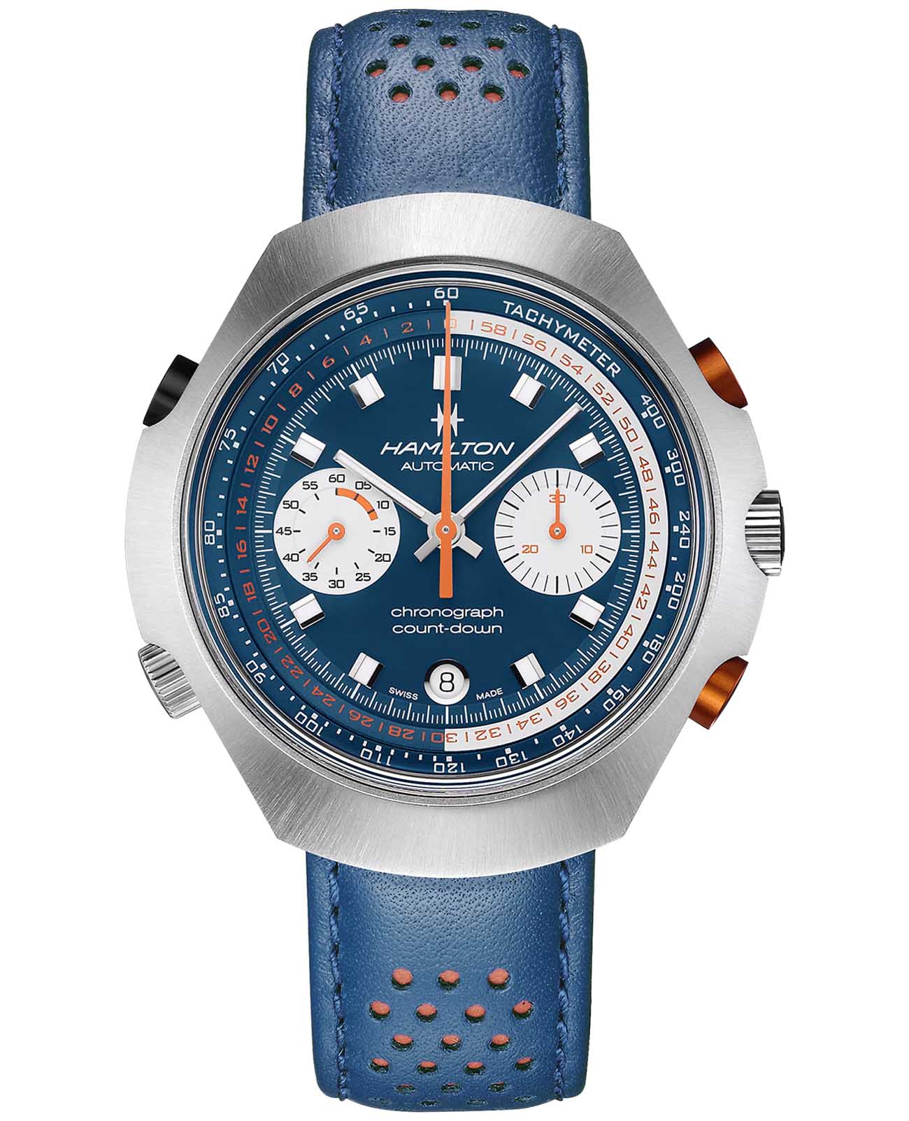 Часы Hamilton American Classic Chrono-Matic 50 (модель H51606640) — лимитированная серия из 150 экземпляров, вдохновленная гоночным духом 1970-х годов и переосмысляющая легендарную модель Chrono-Matic E. Выразительный 48-мм корпус из нержавеющей стали сочетается с контрастной сине-оранжевой палитрой циферблата. Модель оснащена автоматическим калибром H-31 с 60-часовым запасом хода. Ключевые функции включают хронографХронографФункция позволяет измерять отрезки времени с особой точностью: часы, минуты, секунды. Верным признаком хронографа является наличие на циферблате 3 дополнительных окошек-счётчиков., тахиметрическую шкалу на безелеБезельВнешний ободок, закрепляющий стекло. В спортивных часах так называется поворотное кольцо с делениями на циферблате, выполняет роль таймера – замеряет отрезки времени на шкале. Неподвижный безель – элемент декора. Однонаправленно вращающийся безель на дайверских часах позволяет фиксировать моменты погружения и выныривания на поверхность. и окошко даты. Ударопрочное сапфировое стеклоСапфировое стеклоПрочный и надёжный материал из кристалла сапфира синтетического происхождения, характеризующийся особой твёрдостью и устойчивостью к царапинам и повреждениям. с антибликовым покрытиемАнтибликовое покрытиеСлой оксида металла в 0,13-0,3 микрон, благодаря которому стекло часов не бликует и не отражает свет. Антибликовое покрытие уменьшает отражение света в 10 раз, обеспечивая отличную читаемость показателей циферблата. гарантирует защиту от царапин, а спираль баланса Nivachron™Nivachron™Специально разработанный инновационный сплав Nivachron™ повышает устойчивость часов к воздействию магнитных полей. обеспечивает устойчивость к магнитным полям и перепадам температур. Люминесцентное покрытиеЛюминесцентное покрытиеПозволяет считывать показания времени в темноте. Производители наносят на стрелки, часовые индексы, безель или поверхность циферблата светонакопительный состав, дающий холодное свечение. Super-LumiNova на стрелках и индексах обеспечивает видимость в темноте. Водонепроницаемость 10 бар (100 метров) позволяет использовать часы при плавании. Ремешок из перфорированной кожи коровы в двухцветном сине-оранжевом исполнении дополнен классической застёжкой шириной 20 мм.