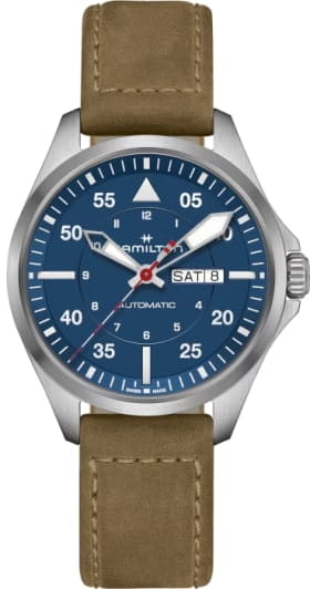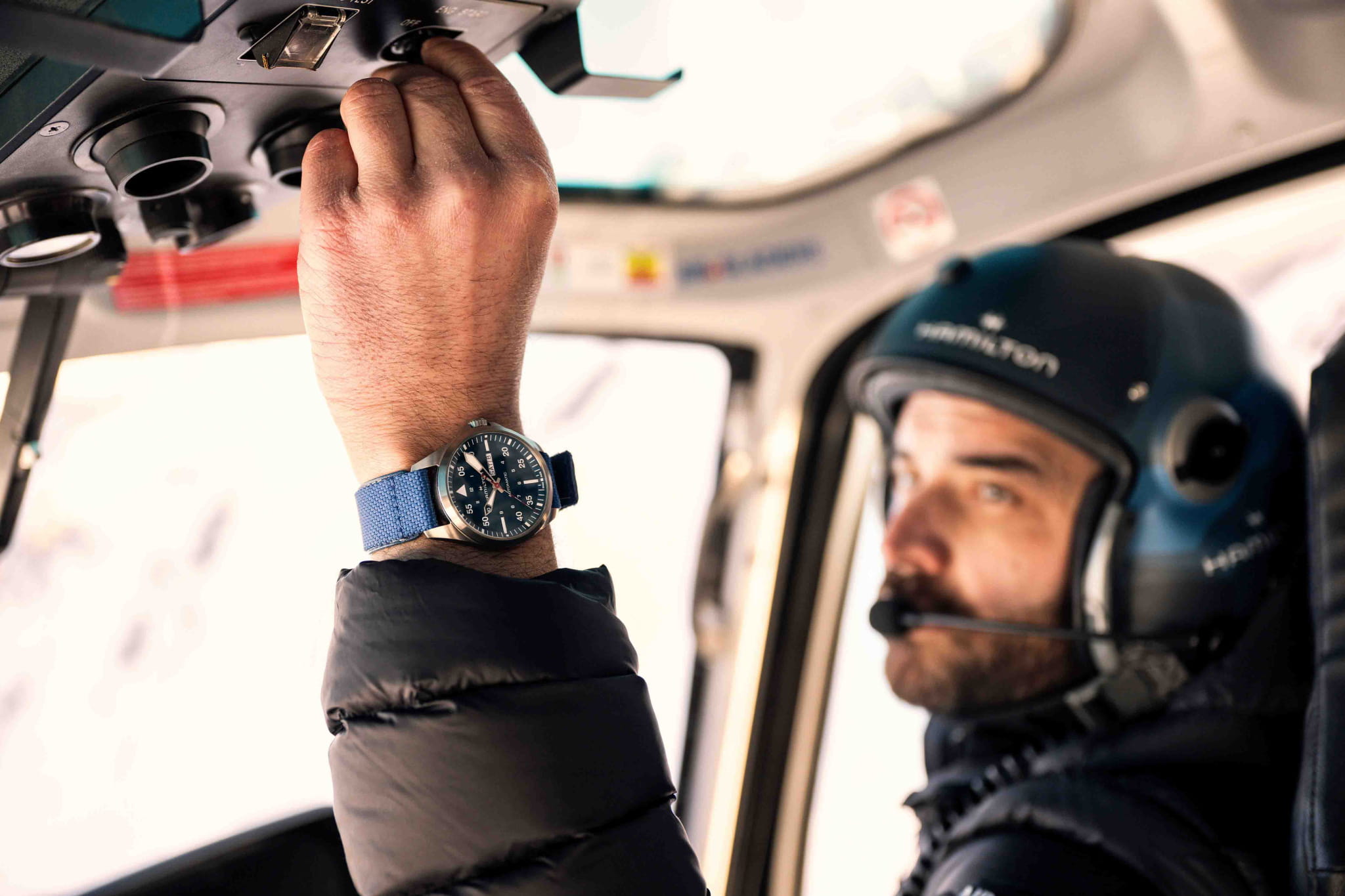 Часы специальной серии Khaki Aviation Pilot посвящены сотрудничеству со швейцарской спасательной вертолетной службой Air-Glaciers. Модель в гипоаллергенном легком корпусе из титана диаметром 42 мм, дополненная синим циферблатом, соединяет долговечность и комфорт. Готовые к любым испытаниям часы сочетают в себе культовый автоматический механизм H-30, 80-часовой запас хода и ремешок с кожаной подкладкой, внешней частью из нейлона и застежкой Velcro, обеспечивающий возможность персонализации. Изделие поставляется в специальной упаковке Pelicase с запасным сменным ремешком из коричневой замши.