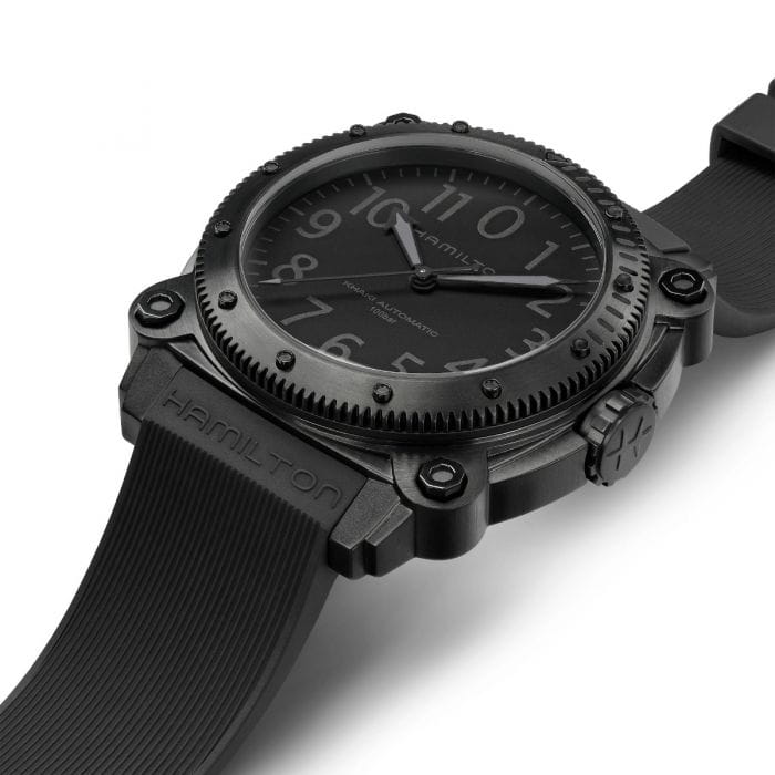 Мужские механические швейцарские часы с автоподзаводом Hamilton Khaki Navy BeLOWZERO Auto Titanium H78505330, автоматический механизм с высокой точностью. Сапфировое стеклоСапфировое стеклоПрочный и надёжный материал из кристалла сапфира синтетического происхождения, характеризующийся особой твёрдостью и устойчивостью к царапинам и повреждениям. устойчивое к появлению царапин, обладающее высокой прозрачностью. Класс водозащиты: 1000 метров, позволит плавать, нырять и заниматься другими водными видами спорта. Корпус часов изготовлен из титана с PVD-покрытиемPVDУльтратонкое покрытие наносится в технике вакуумного напыления, сочетает в себе нитрид титана особой прочности со слоем золота или оксида хрома. Несёт в себе декоративную или защитную функцию.. Стрелки с люминесцентным покрытиемЛюминесцентное покрытиеПозволяет считывать показания времени в темноте. Производители наносят на стрелки, часовые индексы, безель или поверхность циферблата светонакопительный состав, дающий холодное свечение.. Каучуковый ремешок.