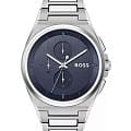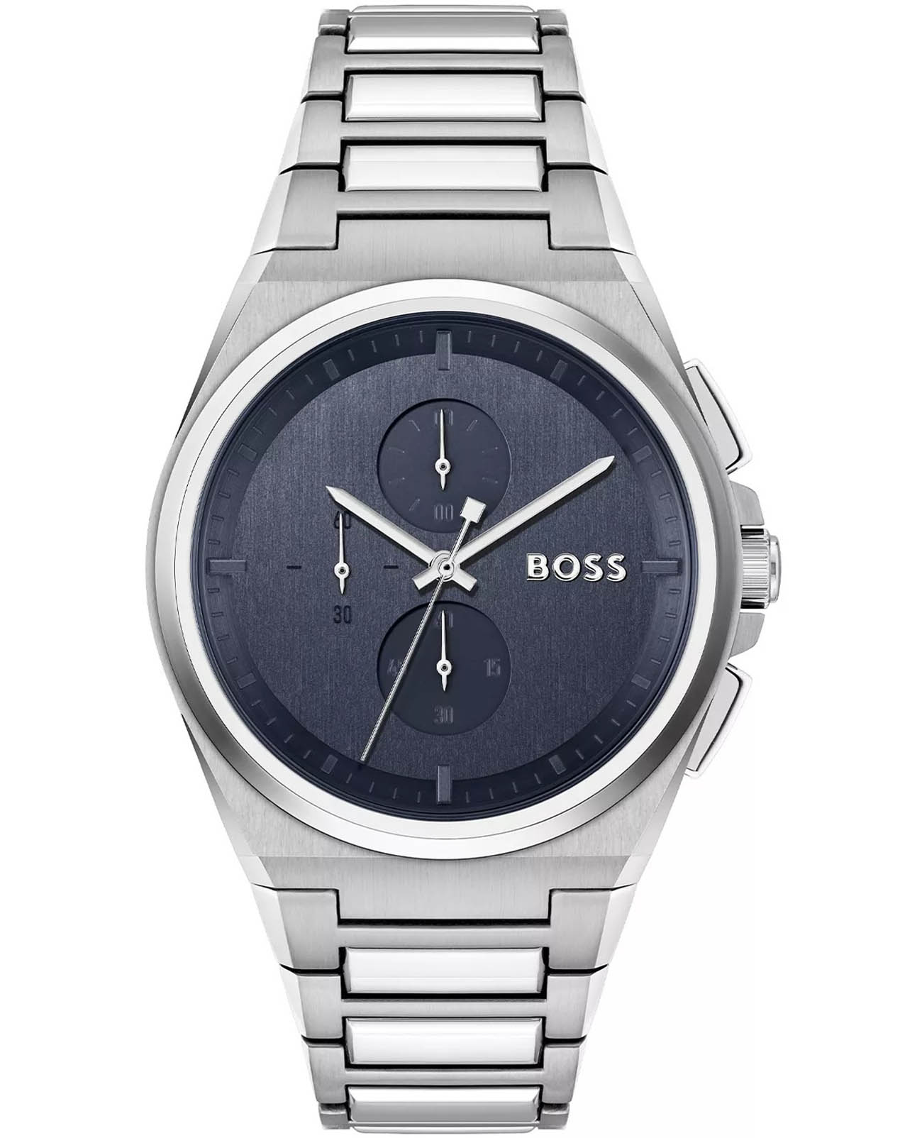 Мужские часы Hugo Boss Steer HB1514048 представлены в круглом 45,8-мм корпусе из нержавеющей стали. Оснащены кварцевым механизмом с функциями хронографаХронографФункция позволяет измерять отрезки времени с особой точностью: часы, минуты, секунды. Верным признаком хронографа является наличие на циферблате 3 дополнительных окошек-счётчиков. и секундомеромСекундомерСекундоме́р — прибор, способный измерять интервалы времени с точностью до долей секунды.. Синий циферблат защищен устойчивым к царапинам минеральным стекломМинеральное стеклоМинеральное стекло представляет собой искусственно выращенный минерал кварца. Такое стекло отличается особой устойчивостью к повреждениям и царапинам. Уступает по некоторым качествам сапфировому стеклу.. Браслет из нержавеющей стали дополнен раскладной застёжкойРаскладная застёжкаТакой тип застёжки используется только на браслетах из металла. Она никогда не раскрывается полностью, происходит разделение на 2 и более частей. Раскладывающая застёжка снизит вероятность потери часов к минимуму.. Водонепроницаемость 50 метров (5 ATM) позволяет использовать часы для плавания.