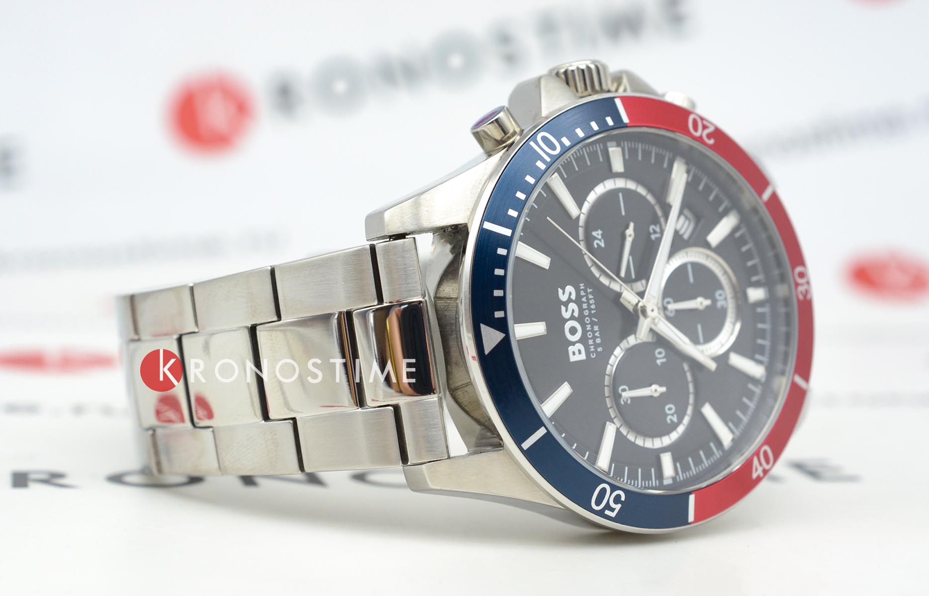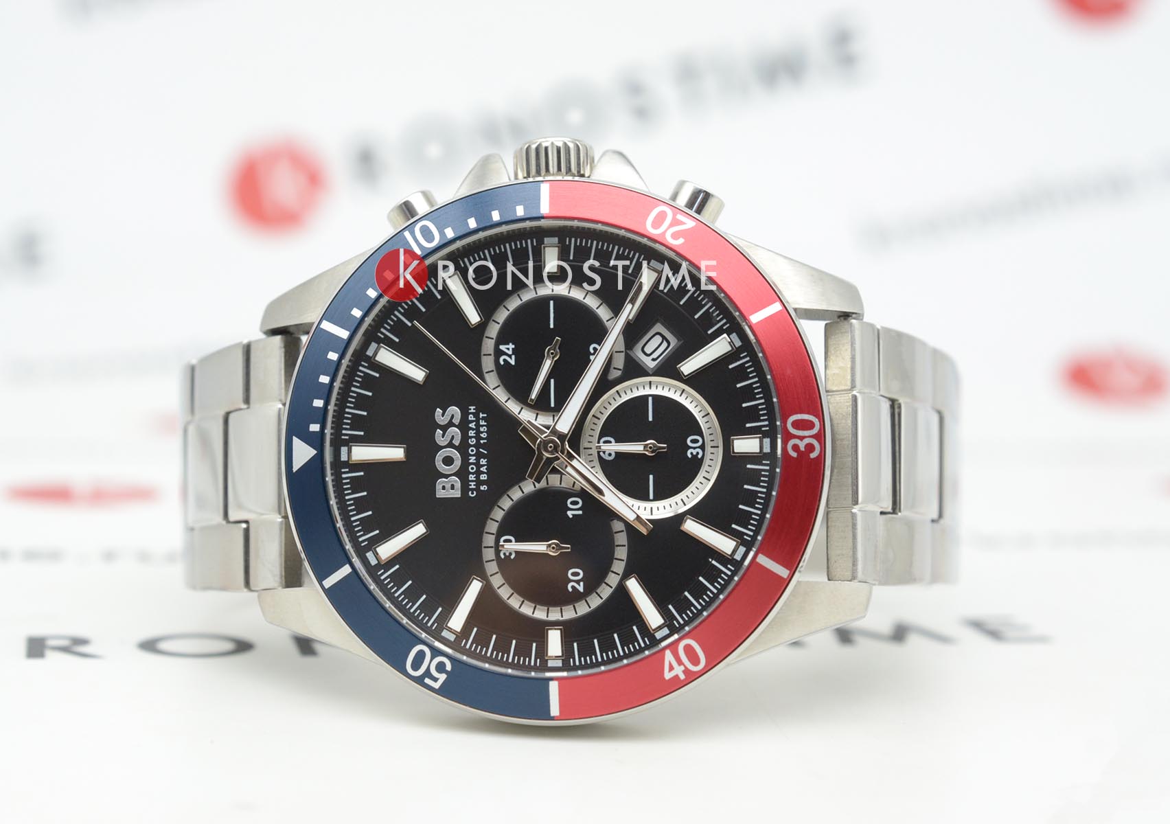 Мужские часы Hugo Boss Troper HB1514108 представлены в круглом 44-мм корпусе из нержавеющей стали с IP-покрытиемIP-покрытиеМетод ионного напыления. Демонстрирует повышенную устойчивость к истиранию, окислению и химическим веществам. Под воздействием высокого давления и температуры около 1500°C молекулы металла надёжно соединяются с частицами корпуса часов.. Оснащены кварцевым механизмом с функциями хронографаХронографФункция позволяет измерять отрезки времени с особой точностью: часы, минуты, секунды. Верным признаком хронографа является наличие на циферблате 3 дополнительных окошек-счётчиков. и секундомеромСекундомерСекундоме́р — прибор, способный измерять интервалы времени с точностью до долей секунды.. Черный циферблат защищен устойчивым к царапинам минеральным стекломМинеральное стеклоМинеральное стекло представляет собой искусственно выращенный минерал кварца. Такое стекло отличается особой устойчивостью к повреждениям и царапинам. Уступает по некоторым качествам сапфировому стеклу., а стрелки покрыты люминесцентным составомЛюминесцентное покрытиеПозволяет считывать показания времени в темноте. Производители наносят на стрелки, часовые индексы, безель или поверхность циферблата светонакопительный состав, дающий холодное свечение. для видимости в темноте. Браслет из нержавеющей стали дополнен раскладной застёжкойРаскладная застёжкаТакой тип застёжки используется только на браслетах из металла. Она никогда не раскрывается полностью, происходит разделение на 2 и более частей. Раскладывающая застёжка снизит вероятность потери часов к минимуму.. Водонепроницаемость 50 метров (5 ATM) позволяет использовать часы для плавания.