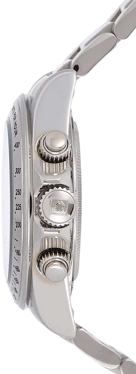Часы оснащены функцией хронографаХронографФункция позволяет измерять отрезки времени с особой точностью: часы, минуты, секунды. Верным признаком хронографа является наличие на циферблате 3 дополнительных окошек-счётчиков. и тахиметрТахиметрРазмеченная шкала, располагается на ободке или безеле часов. Тахиметр позволяет рассчитать скорость на определённом участке пути, расстояние измеряется в километрах или милях., что позволяет точно измерять скорость и время различных событий. Циферблат защищен прочным минеральным стекломМинеральное стеклоМинеральное стекло представляет собой искусственно выращенный минерал кварца. Такое стекло отличается особой устойчивостью к повреждениям и царапинам. Уступает по некоторым качествам сапфировому стеклу., обеспечивающим высокую устойчивость к царапинам. Завинчивающаяся рифленая заводная головка с защитой гарантирует надежную герметизацию механизма, а завинчивающаяся задняя крышка добавляет дополнительную защиту от внешних воздействий.