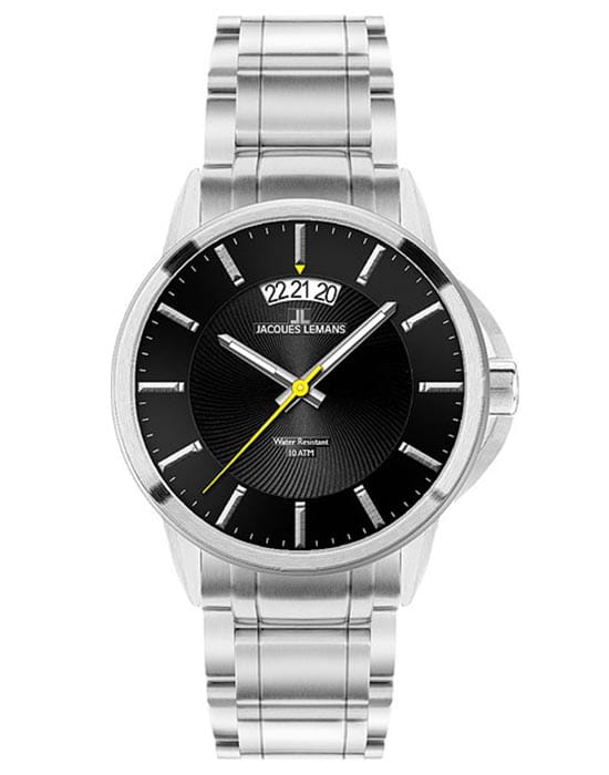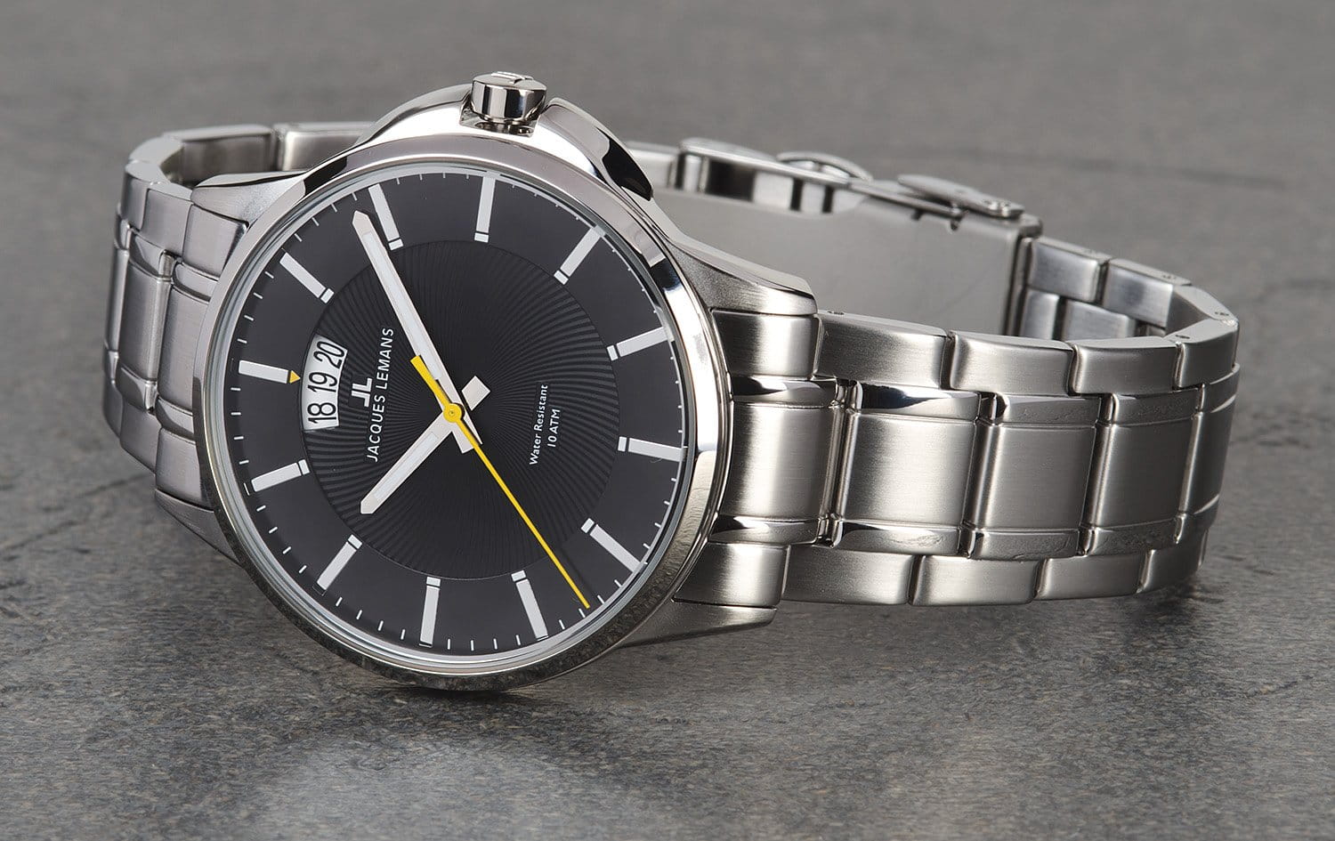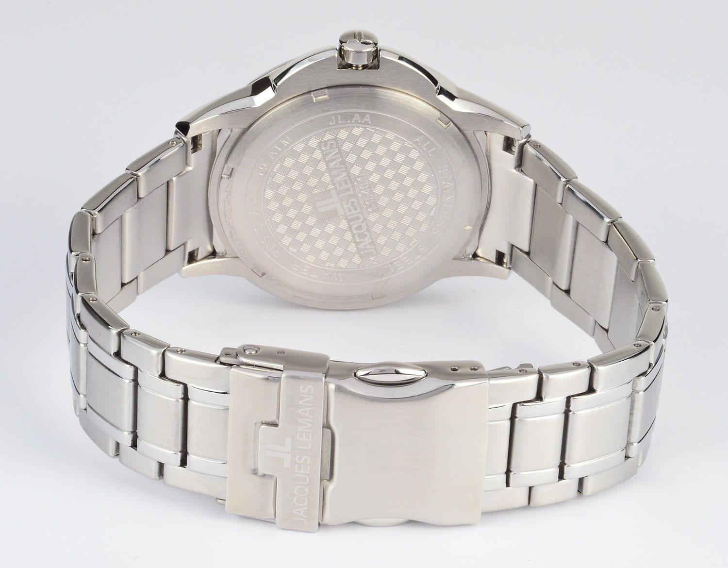 Наручные часы Jacques Lemans классической раскладной застёжкойРаскладная застёжкаТакой тип застёжки используется только на браслетах из металла. Она никогда не раскрывается полностью, происходит разделение на 2 и более частей. Раскладывающая застёжка снизит вероятность потери часов к минимуму. призваны ставить на первое место индивидуальный стиль владельца, классическая элегантность придётся по вкусу каждому. Брендовые часы привлекают минималистичным дизайном, отсутствие вычурности и обилия декорирующих элементов делают модель лучшим решением для ежедневного применения. Аксессуар можно носить с деловыми костюмами и повседневной одеждой, он органично сочетается как с классическими брюками, так и с рваными джинсами. Это настоящее часовое искусство высокого качества, часы считаются актуальным вариантом на все времена и с идеальной точностью показывают время благодаря надёжному японскому механизму.