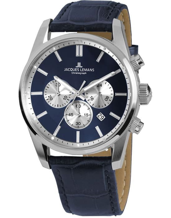 Наручные часы-хронографХронографФункция позволяет измерять отрезки времени с особой точностью: часы, минуты, секунды. Верным признаком хронографа является наличие на циферблате 3 дополнительных окошек-счётчиков. Jacques Lemans с секундомеромСекундомерСекундоме́р — прибор, способный измерять интервалы времени с точностью до долей секунды., 12-ти и 24-х часовым форматом времени, призваны ставить на первое место индивидуальный стиль владельца, классическая элегантность придётся по вкусу каждому.