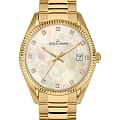 Женские наручные часы, выпущенные в честь 50-летия компании Jacques Lemans. Кварцевый механизм с высокой точностью. Минеральное стеклоМинеральное стеклоМинеральное стекло представляет собой искусственно выращенный минерал кварца. Такое стекло отличается особой устойчивостью к повреждениям и царапинам. Уступает по некоторым качествам сапфировому стеклу. устойчивое к появлению царапин, обладающее высокой прозрачностью. Окошко даты расположилось на трех часах. Стрелки и метки с люминесцентным покрытиемЛюминесцентное покрытиеПозволяет считывать показания времени в темноте. Производители наносят на стрелки, часовые индексы, безель или поверхность циферблата светонакопительный состав, дающий холодное свечение.. БезельБезельВнешний ободок, закрепляющий стекло. В спортивных часах так называется поворотное кольцо с делениями на циферблате, выполняет роль таймера – замеряет отрезки времени на шкале. Неподвижный безель – элемент декора. Однонаправленно вращающийся безель на дайверских часах позволяет фиксировать моменты погружения и выныривания на поверхность. с PVD-покрытиемPVDУльтратонкое покрытие наносится в технике вакуумного напыления, сочетает в себе нитрид титана особой прочности со слоем золота или оксида хрома. Несёт в себе декоративную или защитную функцию.. Класс водозащиты: 100 метров, позволит плавать, нырять и заниматься другими водными видами спорта. Корпус из нержавеющей стали с PVD-покрытиемPVDУльтратонкое покрытие наносится в технике вакуумного напыления, сочетает в себе нитрид титана особой прочности со слоем золота или оксида хрома. Несёт в себе декоративную или защитную функцию.. Браслет часов изготовлен из нержавеющей стали с PVD-покрытиемPVDУльтратонкое покрытие наносится в технике вакуумного напыления, сочетает в себе нитрид титана особой прочности со слоем золота или оксида хрома. Несёт в себе декоративную или защитную функцию..